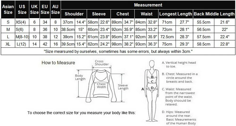 - Size: There are 4 sizes (S/M/L/XL) available for the following listing. please allow 1-2cm differs due to manual measurement, thanks (All measurement in cm and please note 1cm=0.39inch)