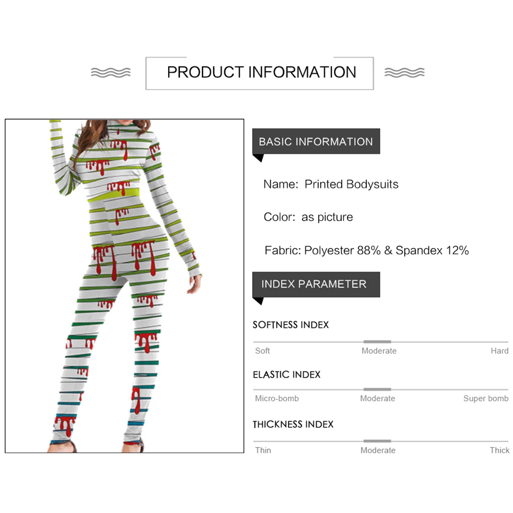 The Women’s Halloween Blood Palm Print Muscle Print Role Playing Skinny Jumpsuit For Holiday Party made of blended fabric feels comfortable and exquisite. It is simple and delicate. It is a perfect version type for daily appointment, party and holiday carnival!
