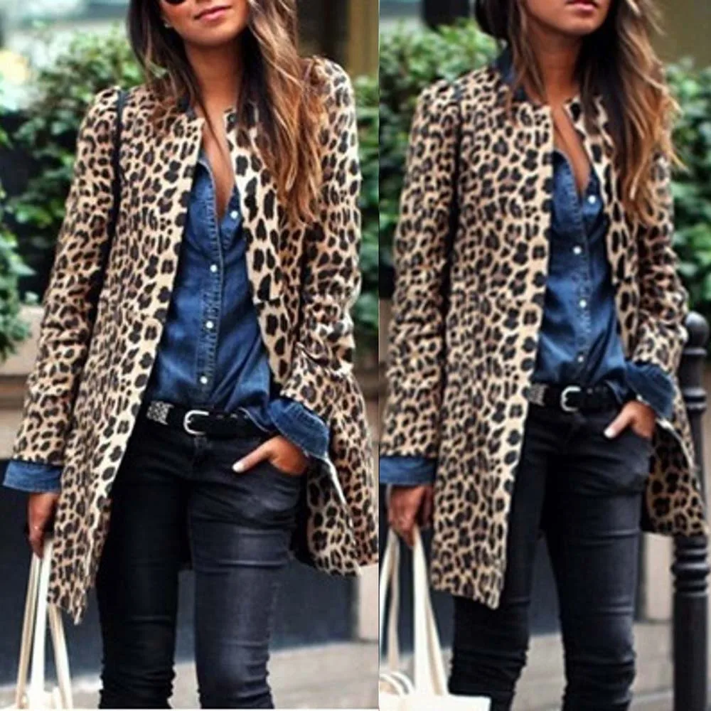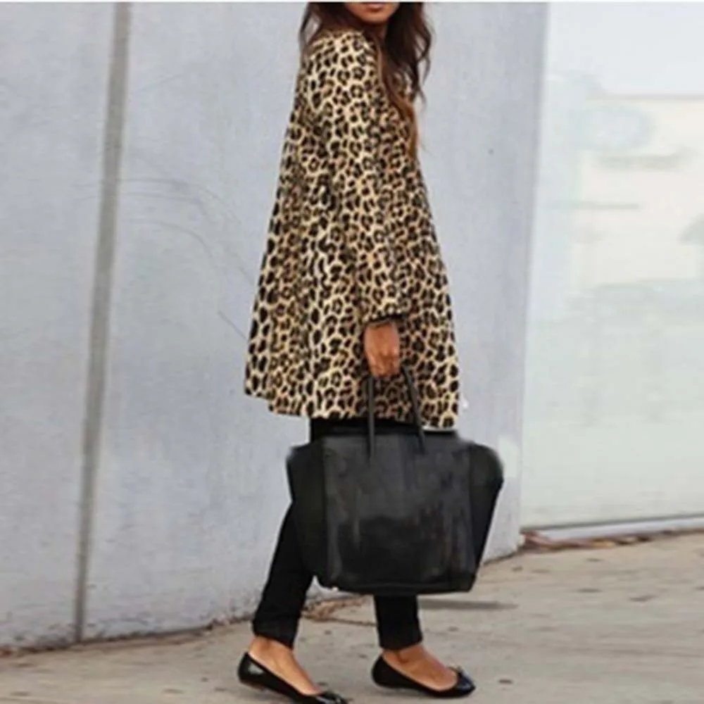 Women Leopard Sexy Winter Warm New Wind Coat Cardigan Leopard Print Long Coat
