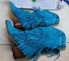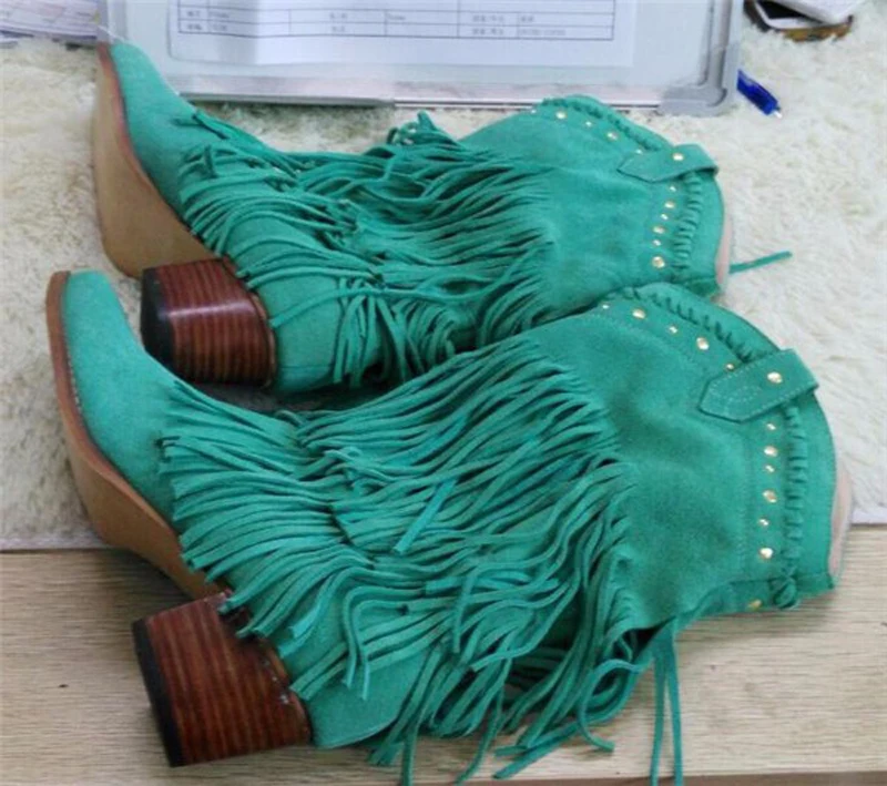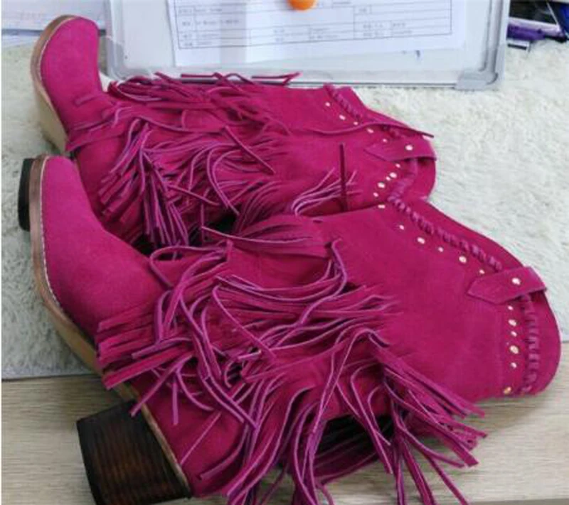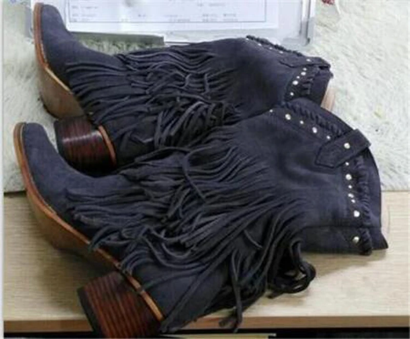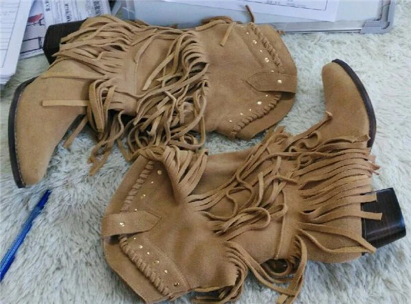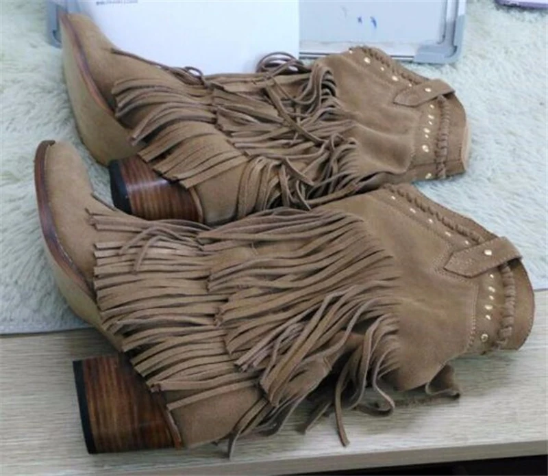 Women Mid-calf Low Heel Bohemia Style Gladiator Motorcycle Boots Fringed Cowboy Boots Shoes Spring Autumn Women Tassel Boots