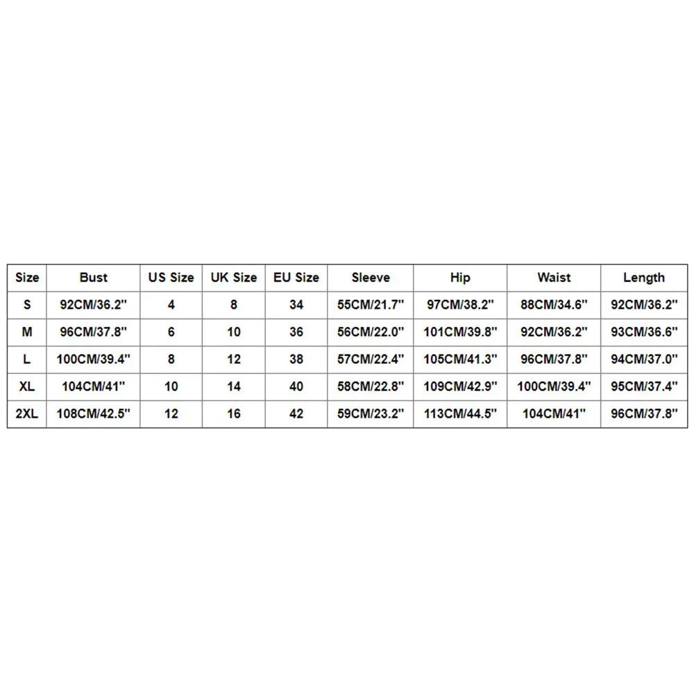 Size Bust US Size UK Size EU Size Sleeve Hip Waist Length S 92CM/36.2″ 4 8 34 55CM/21.7″ 97CM/38.2″ 88CM/34.6″ 92CM/36.2″ M 96CM/37.8″ 6 10 36 56CM/22.0″ 101CM/39.8″ 92CM/36.2″ 93CM/36.6″ L 100CM/39.4″ 8 12 38 57CM/22.4″ 105CM/41.3″ 96CM/37.8″ 94CM/37.0″ XL 104CM/41″ 10 14 40 58CM/22.8″ 109CM/42.9″ 100CM/39.4″ 95CM/37.4″ 2XL 108CM/42.5″ 12 16 42 59CM/23.2″ 113CM/44.5″ 104CM/41″ 96CM/37.8″ ![]()