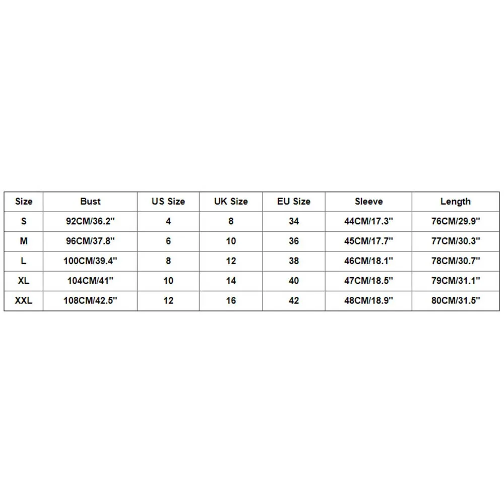 Size Bust US Size UK Size EU Size Sleeve Length S 92CM/36.2″ 4 8 34 44CM/17.3″ 76CM/29.9″ M 96CM/37.8″ 6 10 36 45CM/17.7″ 77CM/30.3″ L 100CM/39.4″ 8 12 38 46CM/18.1″ 78CM/30.7″ XL 104CM/41″ 10 14 40 47CM/18.5″ 79CM/31.1″ XXL 108CM/42.5″ 12 16 42 48CM/18.9″ 80CM/31.5″ ![]()