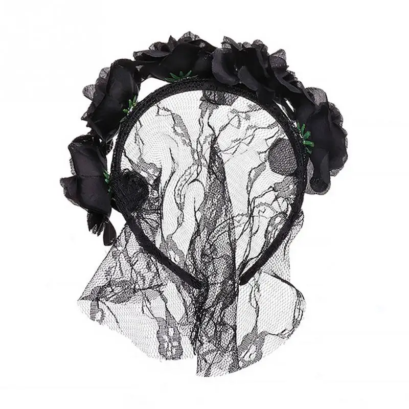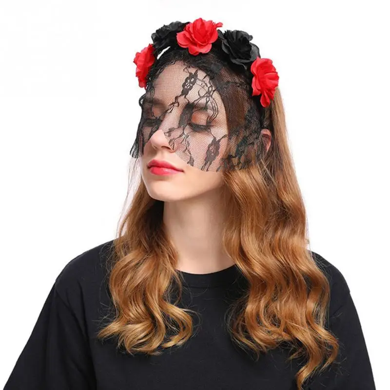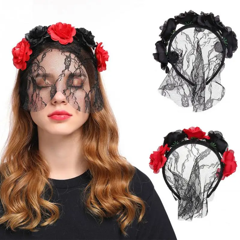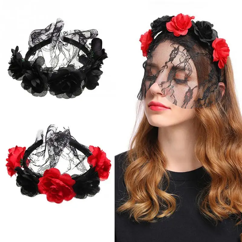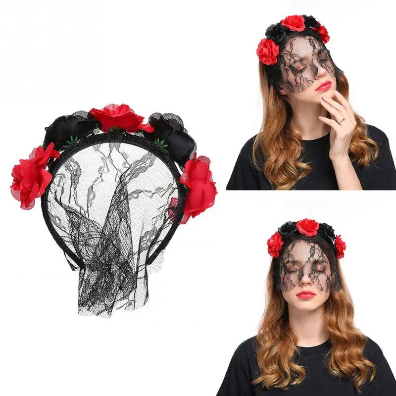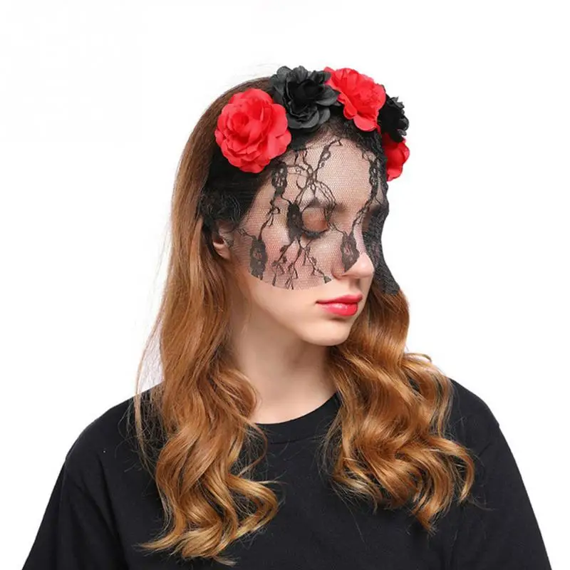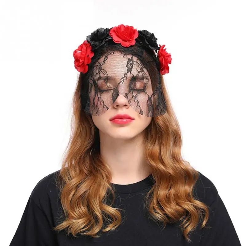 Women Party Ball Mask Hair Accessories Photography Props Artificial Rose Halloween Headband With Veil Hair Band festival wear