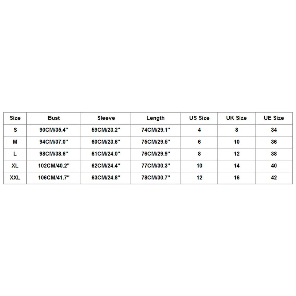 Size:XL Bust:102CM/40.2″ Sleeve:62CM/24.4″ Length:77CM/30.3″ US Size:10 UK Size:14 UE Size:40