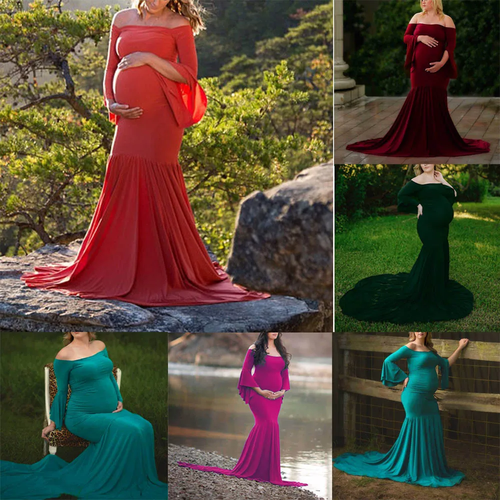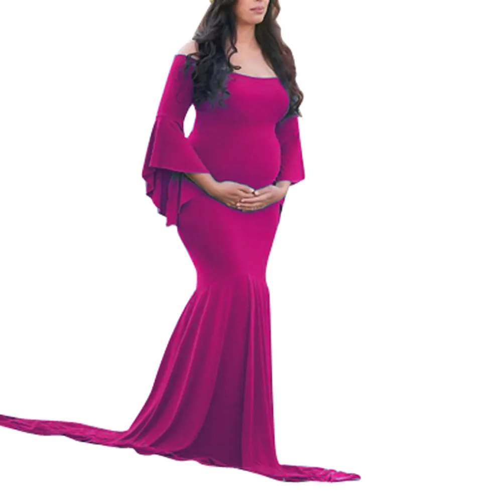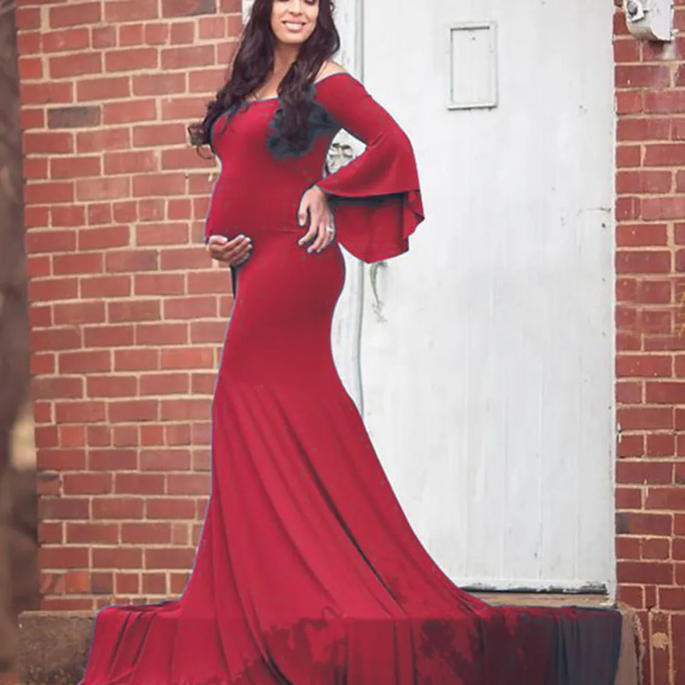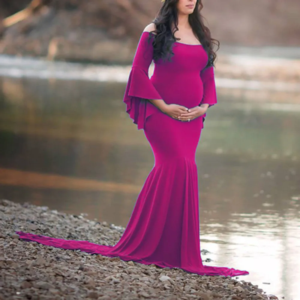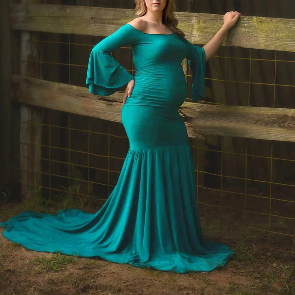 Women Pregnants Sexy Photography Props Long Dress One-Shouldered Ruffled Flare Sleeve Long Sleeve Pregnant Tail Dress Summer