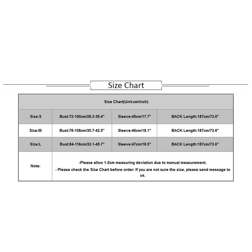 | Size:L | Bust:84-116cm/33.1-45.7″ | Sleeve:47cm/18.5″ | BACK Length:187cm/73.6″ |