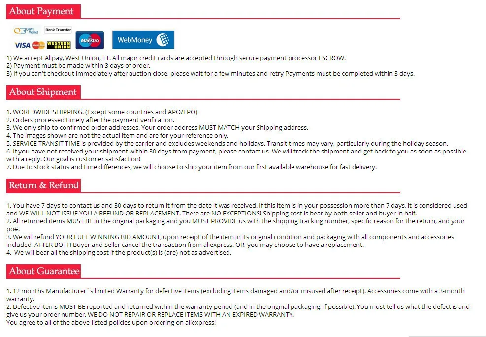 • If you did not receive the product within the guaranteed time( 45 days not including 2-5 day processing) you can request a refund or a reshipment.
