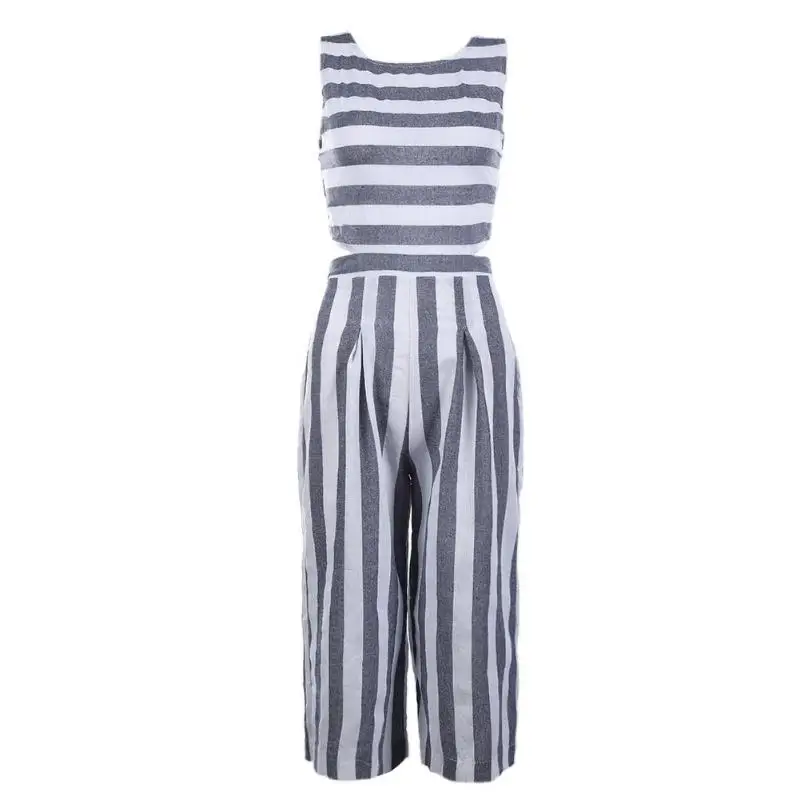 Sexy Elegant Women Stripes Casual Hollow Out Linen Round Collar Sleeveless Jumpsuits