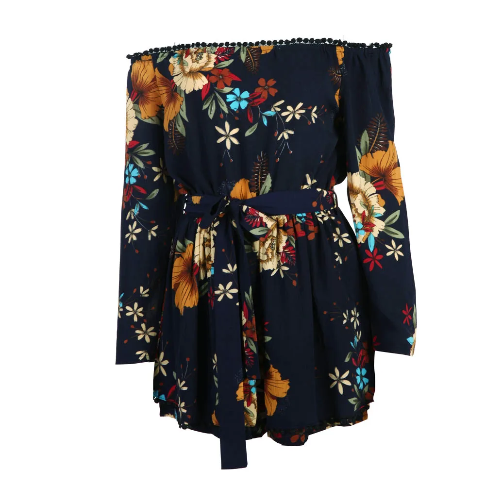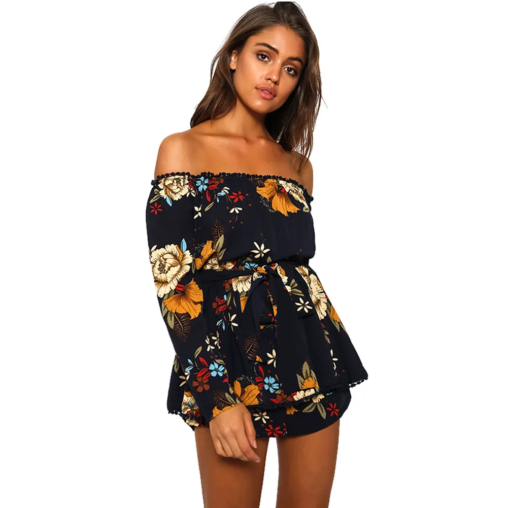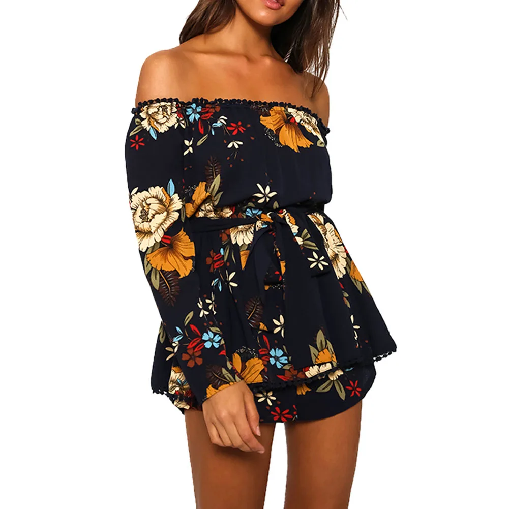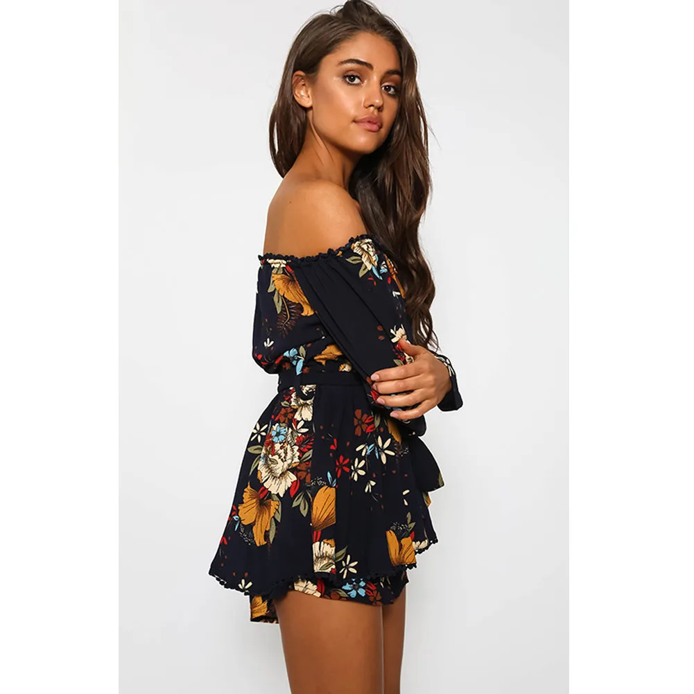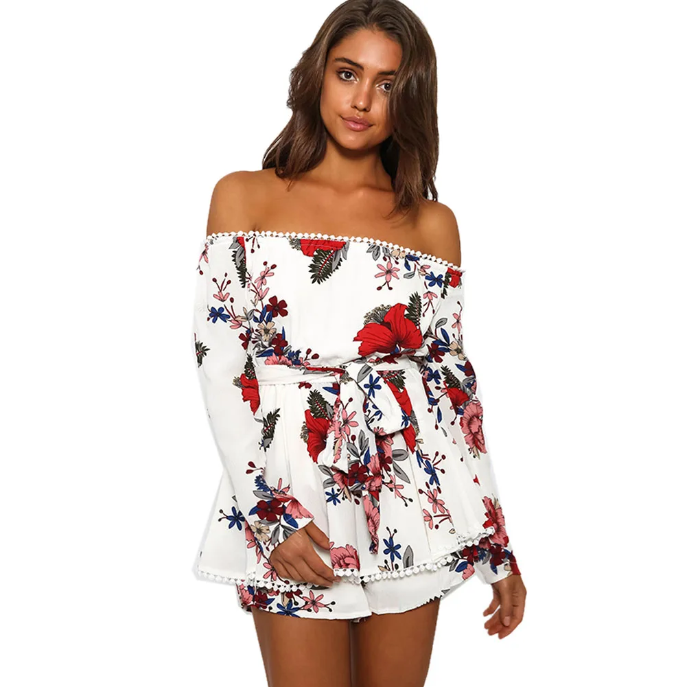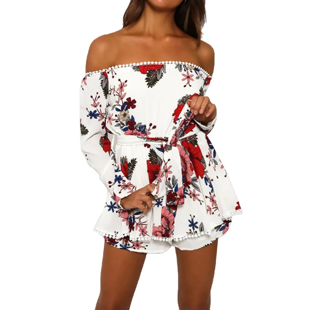 Women Sexy Off Shoulder Romper Floral Printed Ruffle Elegant Jumpsuit 2018 Summer Style beach short playsuit Women overalls+Belt