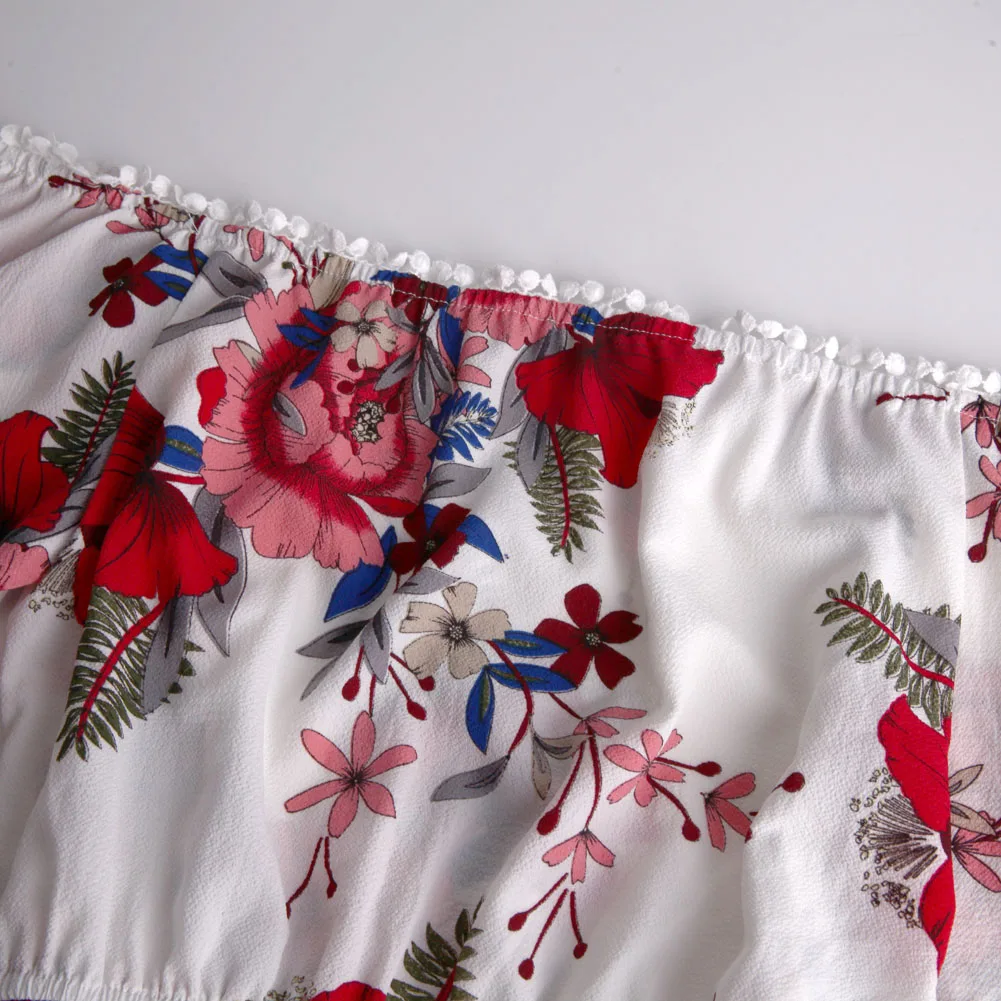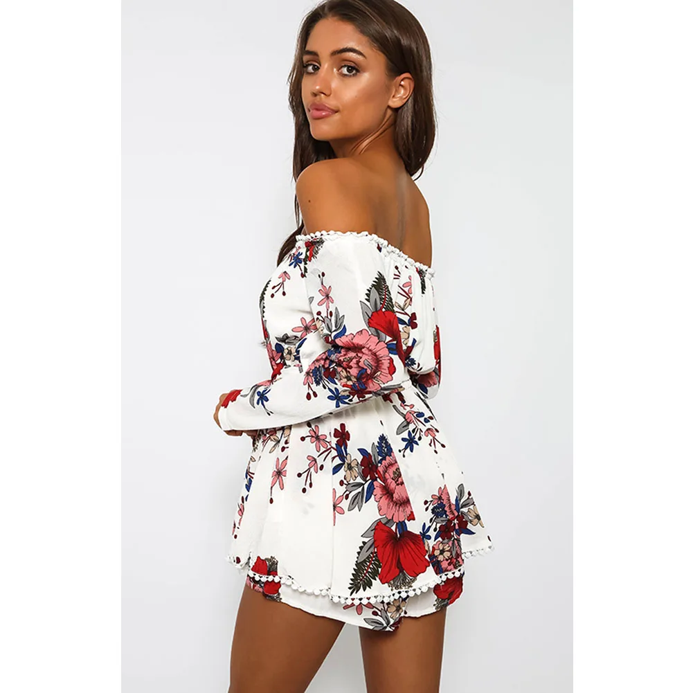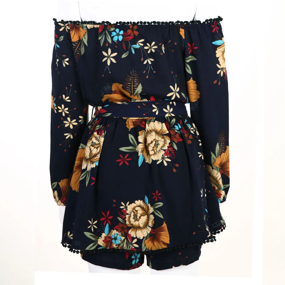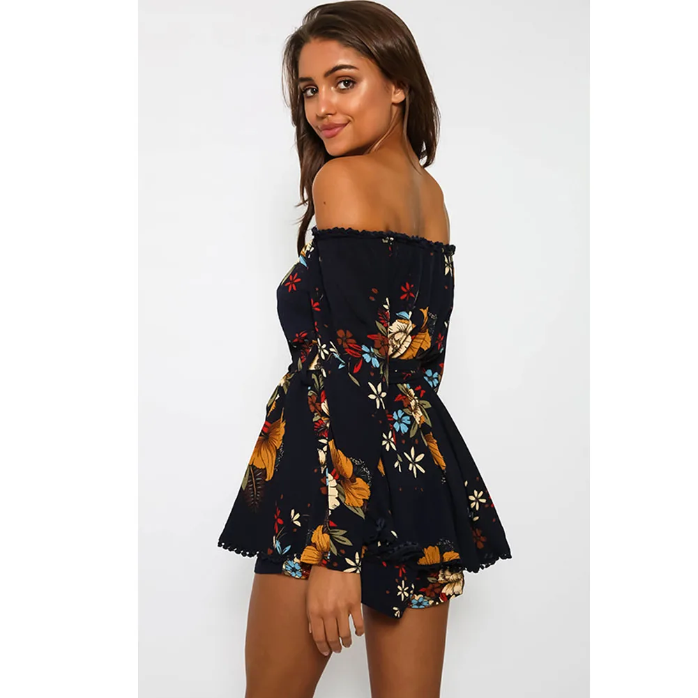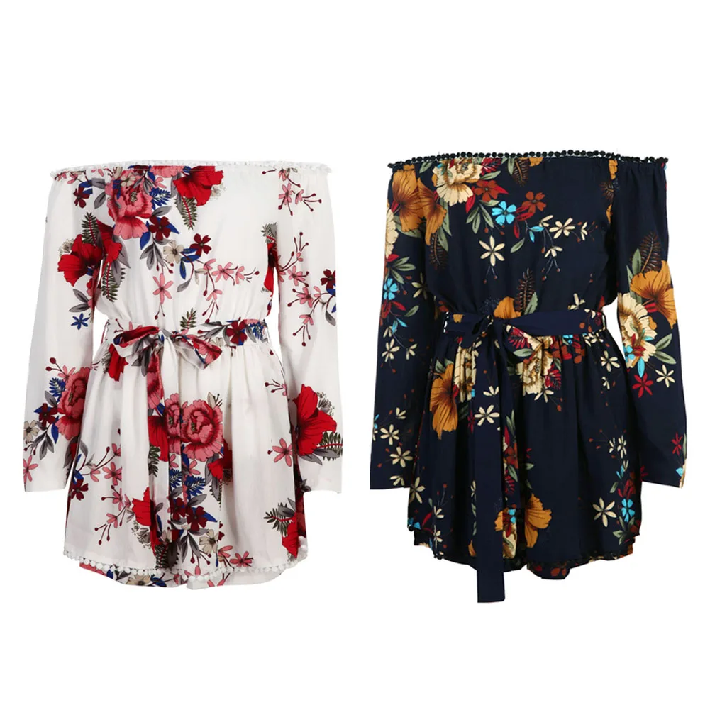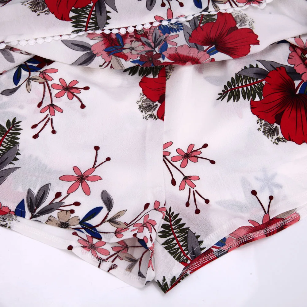 Women Sexy Off Shoulder Romper Floral Printed Ruffle Elegant Jumpsuit 2018 Summer Style beach short playsuit Women overalls+Belt