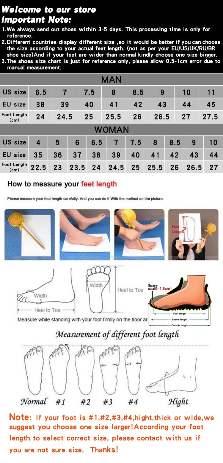 Please choose correct size according to your foot length, not as per your EU/US/UK/RU/BR shoe size.