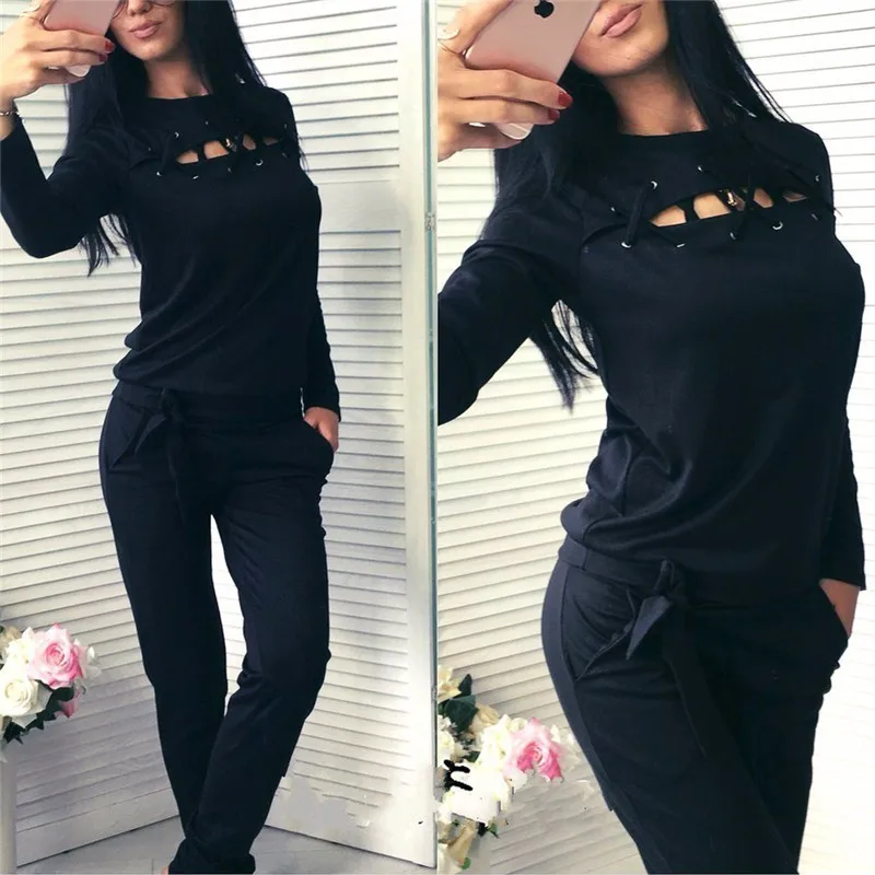 Women Sportswear Autumn Hollow Bandage Solid Tracksuits O-neck Long Sleeve Sweatshirt and Pant Running Two Piece Set Casual Suit