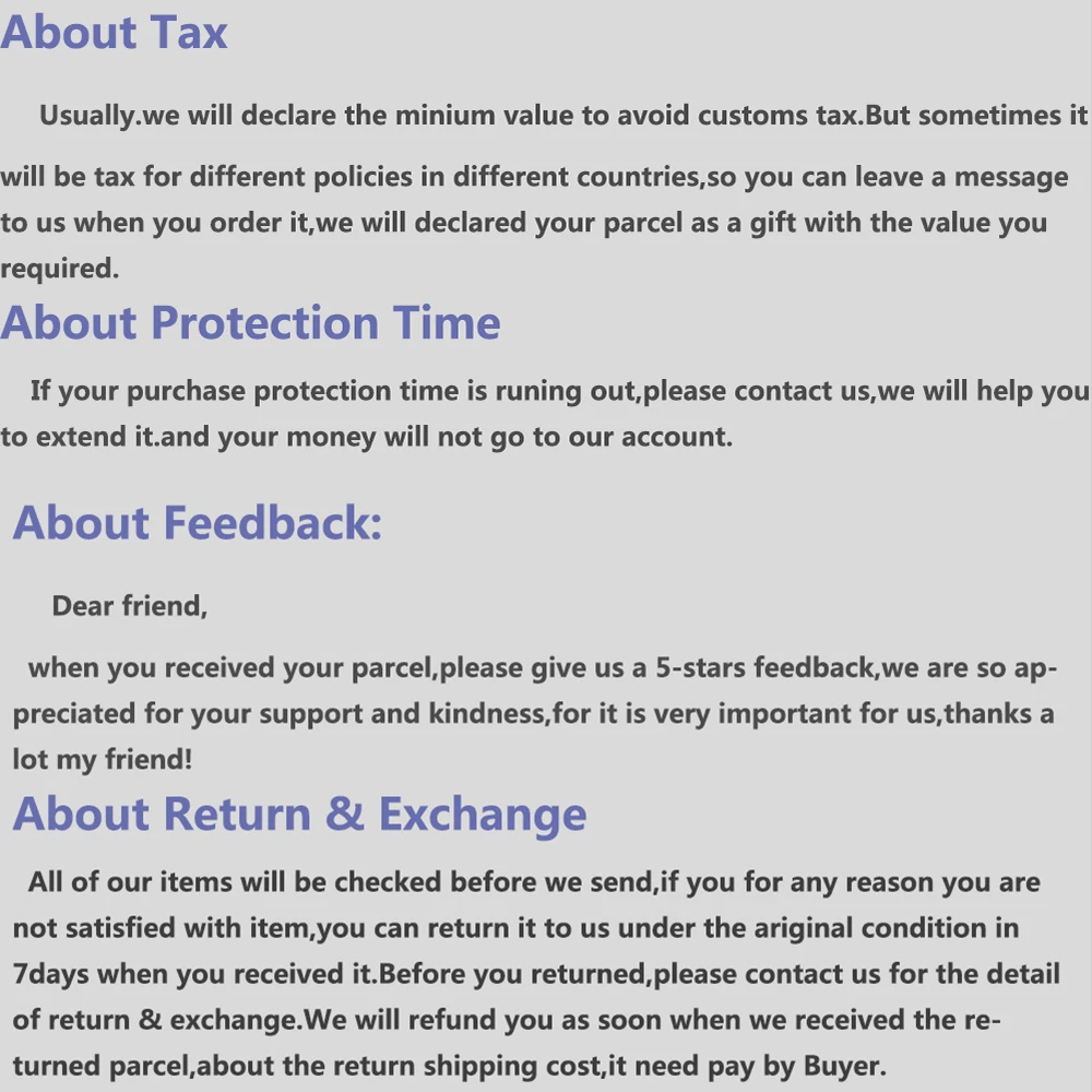 We are not responsible for any custom fees once the items have shipped. By purchasing our products, you consent that one or more packages may be shipped to you and may get custom fees when they arrive in your country.