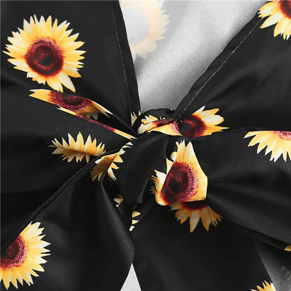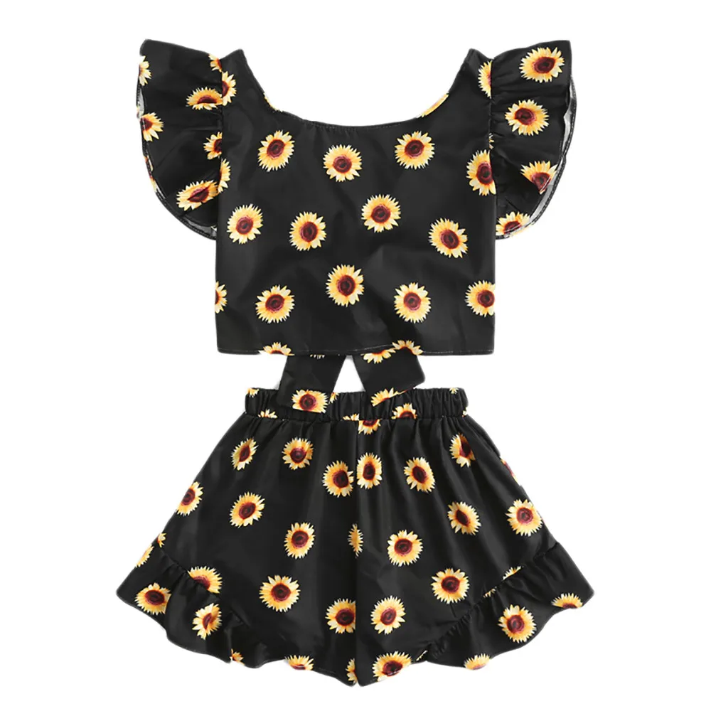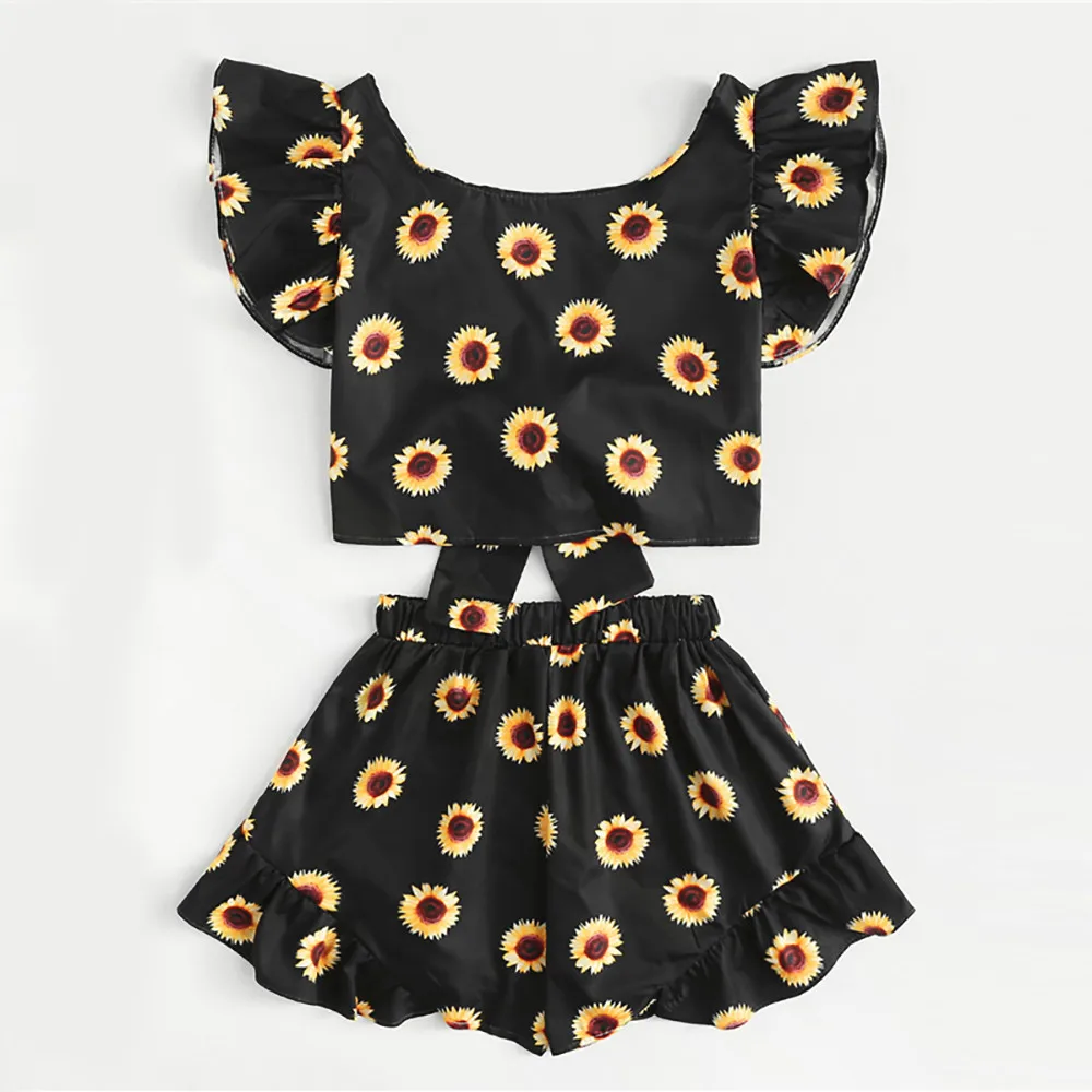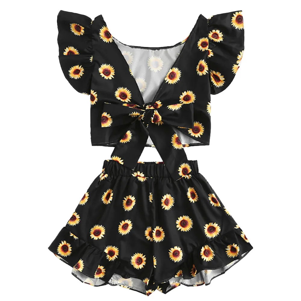 Women Summer Sunflower Print Set 2018 Women Bandage Blouse V-Neck Shirt Crop Tops+Mini Shorts Pants Beach Wear 2pcs Suit Set
