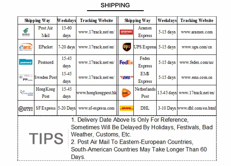 Packages from our warehouse in China will be shipped by ePacket or EMS depending on the weight and size of the product. Packages shipped from our US warehouse are shipped through USPS.