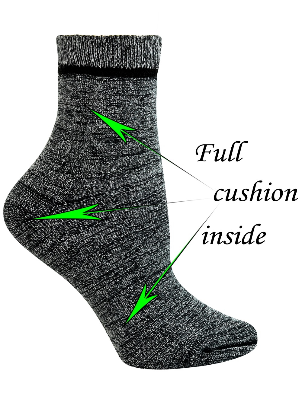 - Full cushion design. Reinforced heel and toe, extra cushioning for added comfort and protection. Padded with right thickness cushion (about 70g/pair) keep your feet warm and comfortable