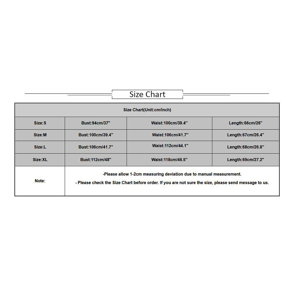 | Size:M | Bust:100cm/39.4″ | Waist:106cm/41.7” | Length:67cm/26.4″ |
