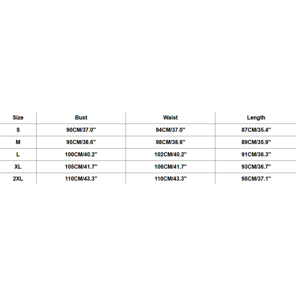 Size Bust Waist Length S 90CM/37.0″ 94CM/37.0″ 87CM/35.4″ M 95CM/38.6″ 98CM/38.6″ 89CM/35.9″ L 100CM/40.2″ 102CM/40.2″ 91CM/36.3″ XL 105CM/41.7″ 106CM/41.7″ 93CM/36.7″ 2XL 110CM/43.3″ 110CM/43.3″ 95CM/37.1″ ![]()