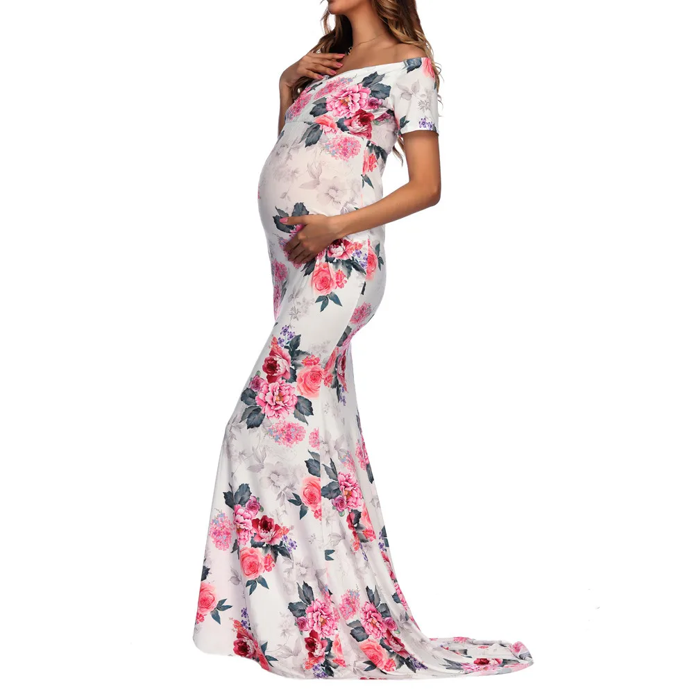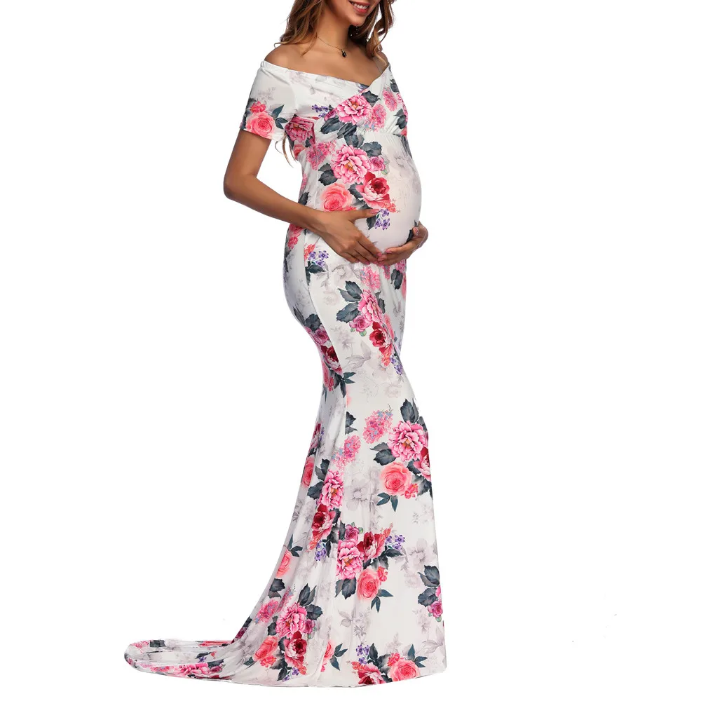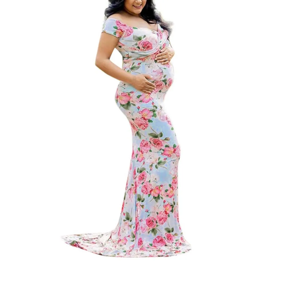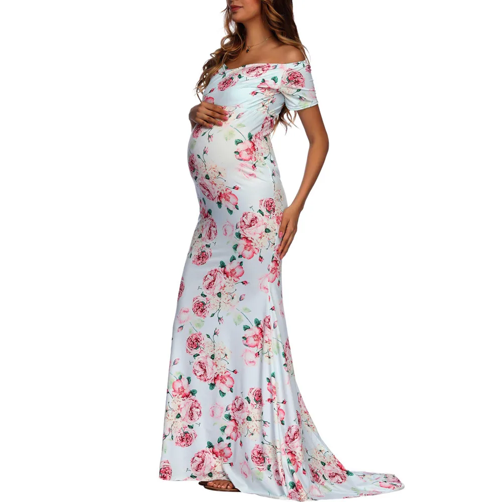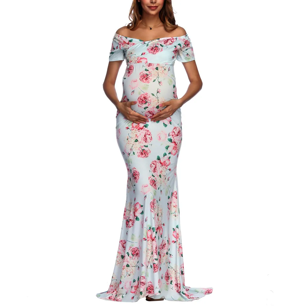 Womens Off Shoulder Short Sleeve Pregnant Photography Dresses Sexy Comfortable Nursing Floral Printed Elegant Long Dresses