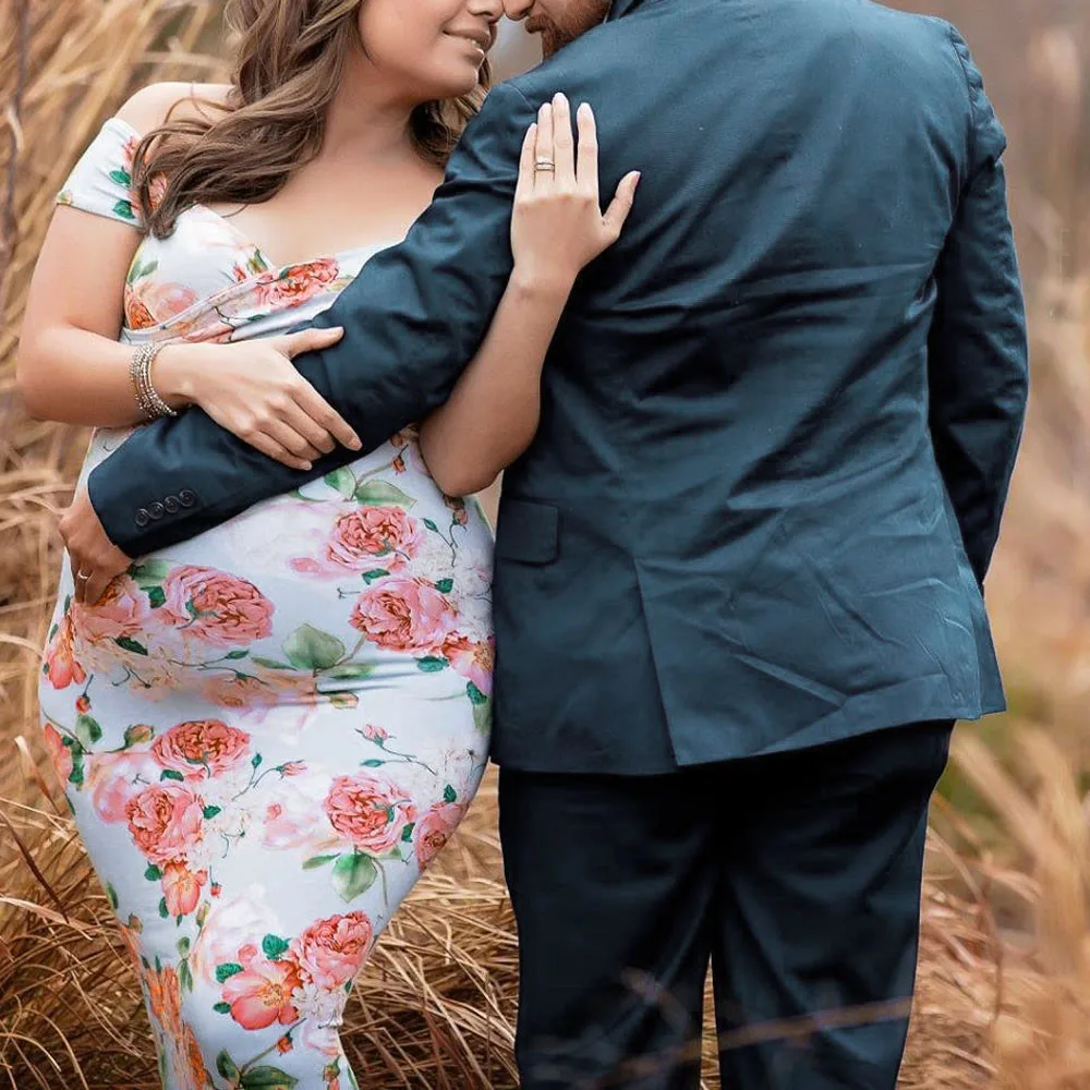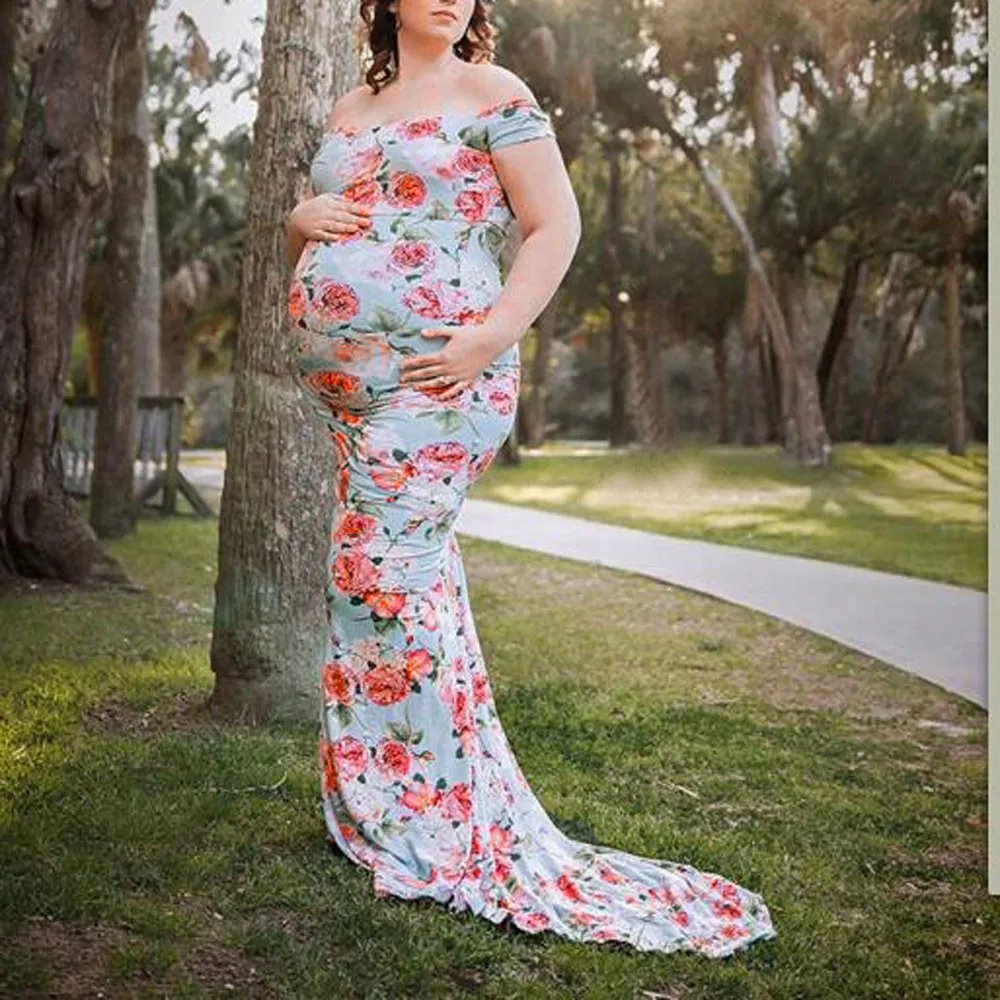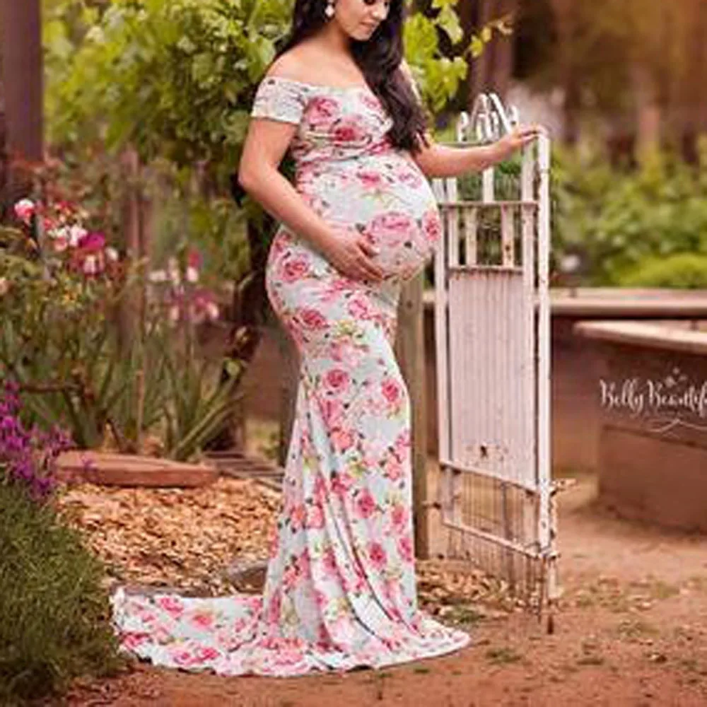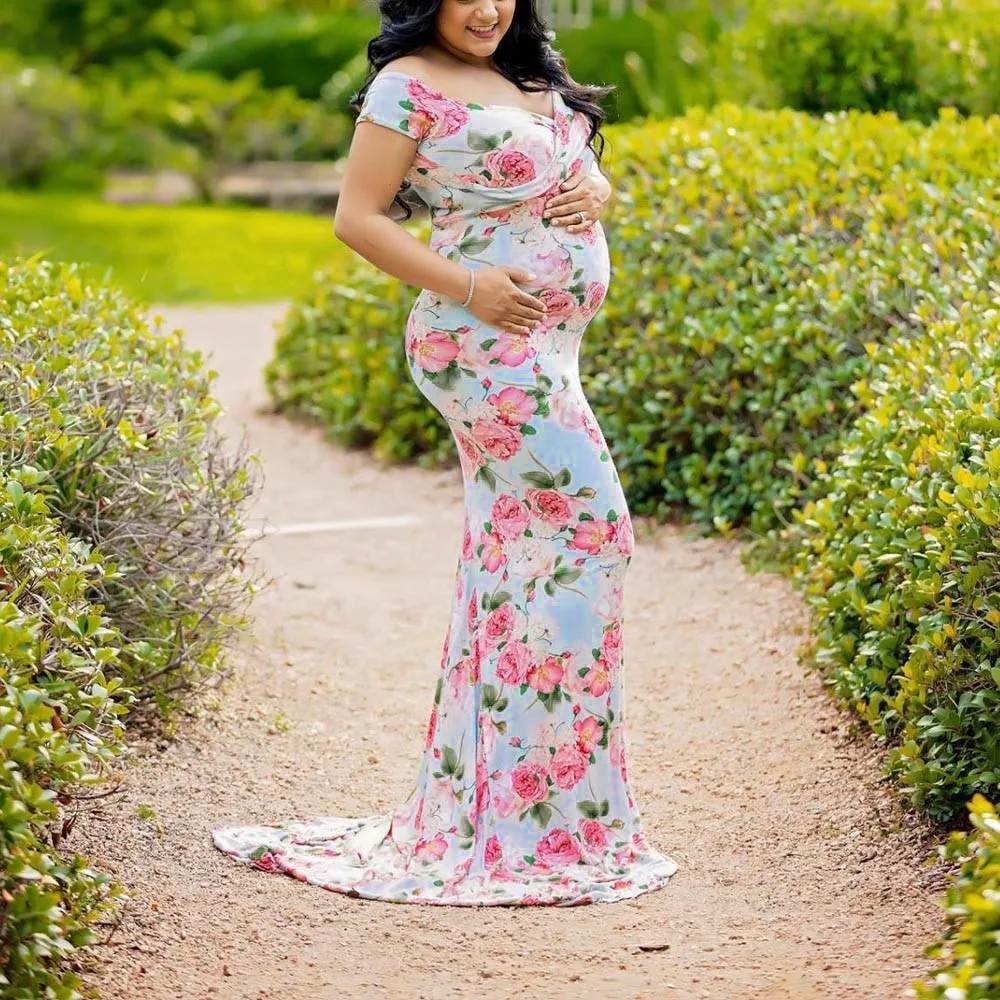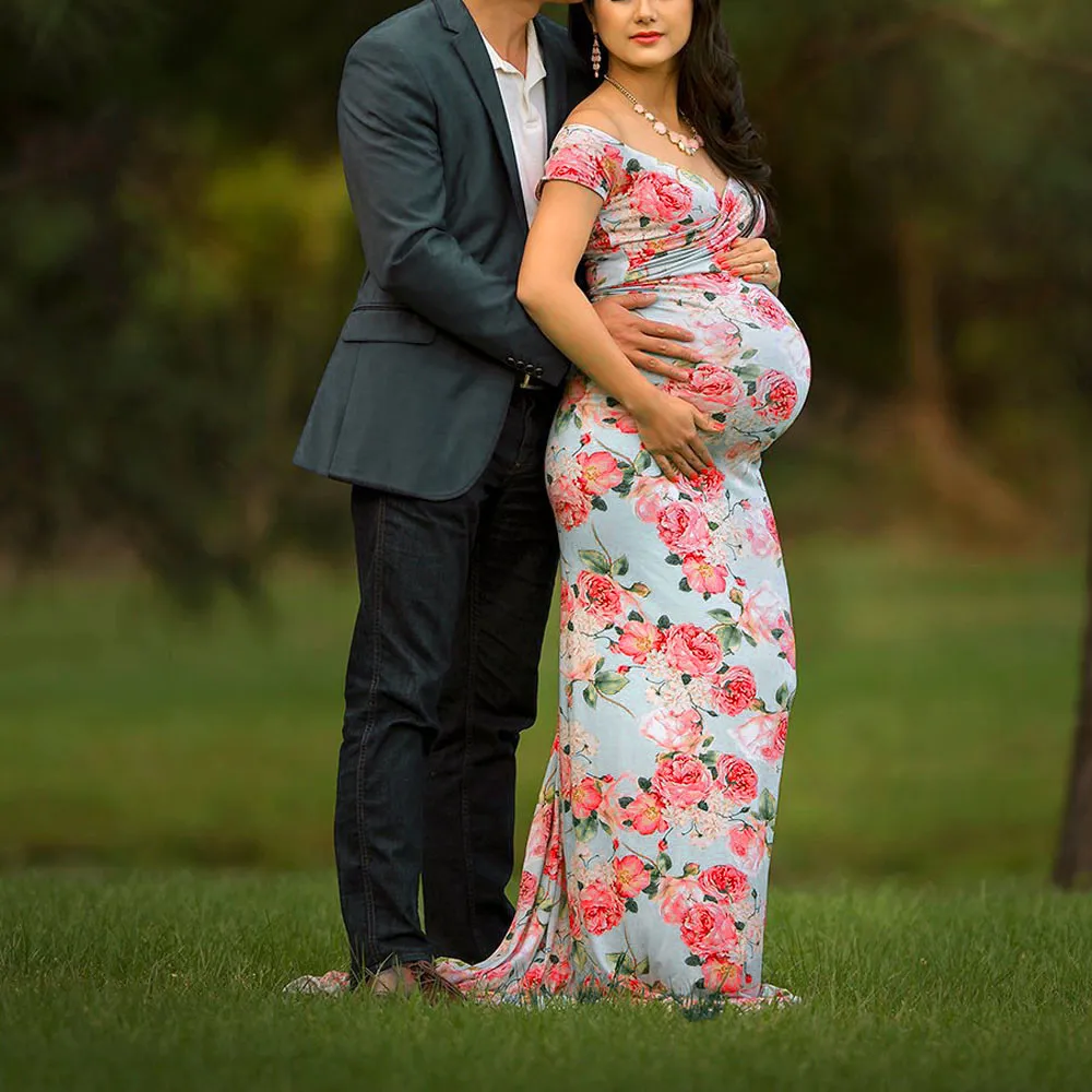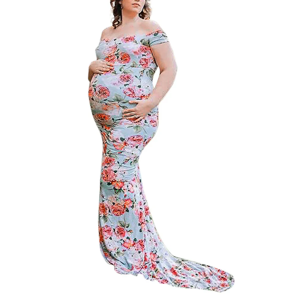 Womens Off Shoulder Short Sleeve Pregnant Photography Dresses Sexy Comfortable Nursing Floral Printed Elegant Long Dresses