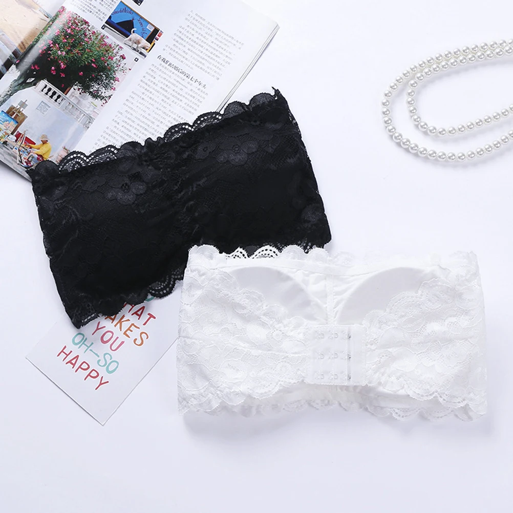 2pcs Womens One Size Strapless Lace Bandeau Bra Padded Removable Seamless Stretch Bandeau Tube Bra Top (White & Black)