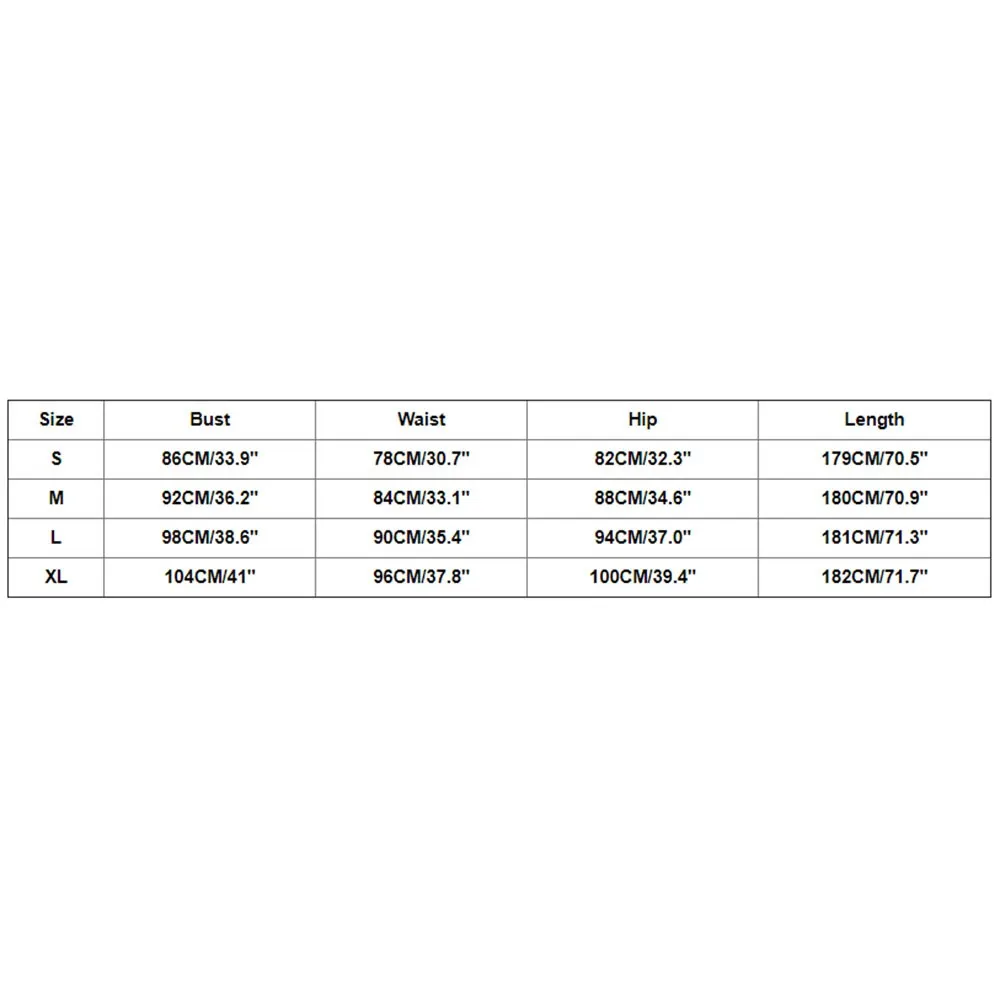 Size Bust Waist Hip Length S 86CM/33.9″ 78CM/30.7″ 82CM/32.3″ 179CM/70.5″ M 92CM/36.2″ 84CM/33.1″ 88CM/34.6″ 180CM/70.9″ L 98CM/38.6″ 90CM/35.4″ 94CM/37.0″ 181CM/71.3″ XL 104CM/41″ 96CM/37.8″ 100CM/39.4″ 182CM/71.7″ ![]()
