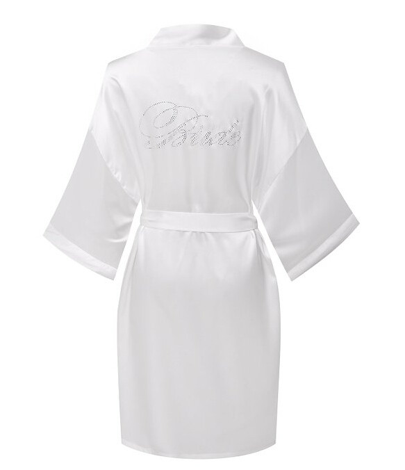 - Elegant bride & bridesmaid kimono robe. Featuring with rhinestone design, two seam pockets, self belted, cross wrap v neck, solid color, comfortable and soft material. A must-have for the bride&bridesmaid.