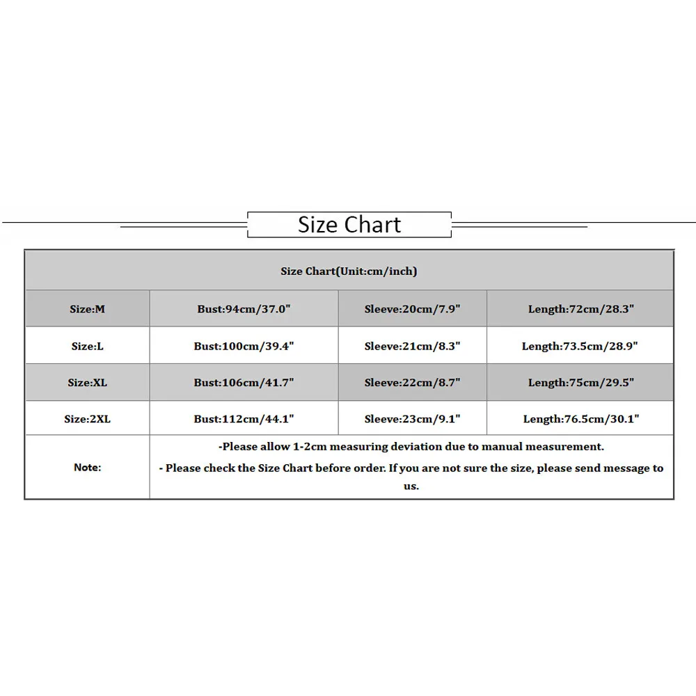 | Size:M | Bust:94cm/37.0″ | Sleeve:20cm/7.9″ | Length:72cm/28.3″ |