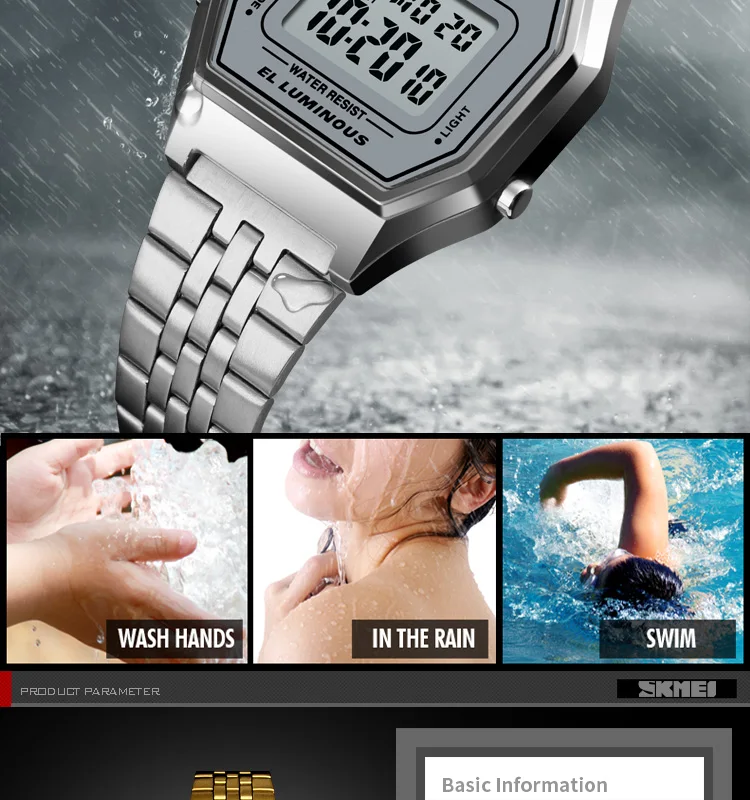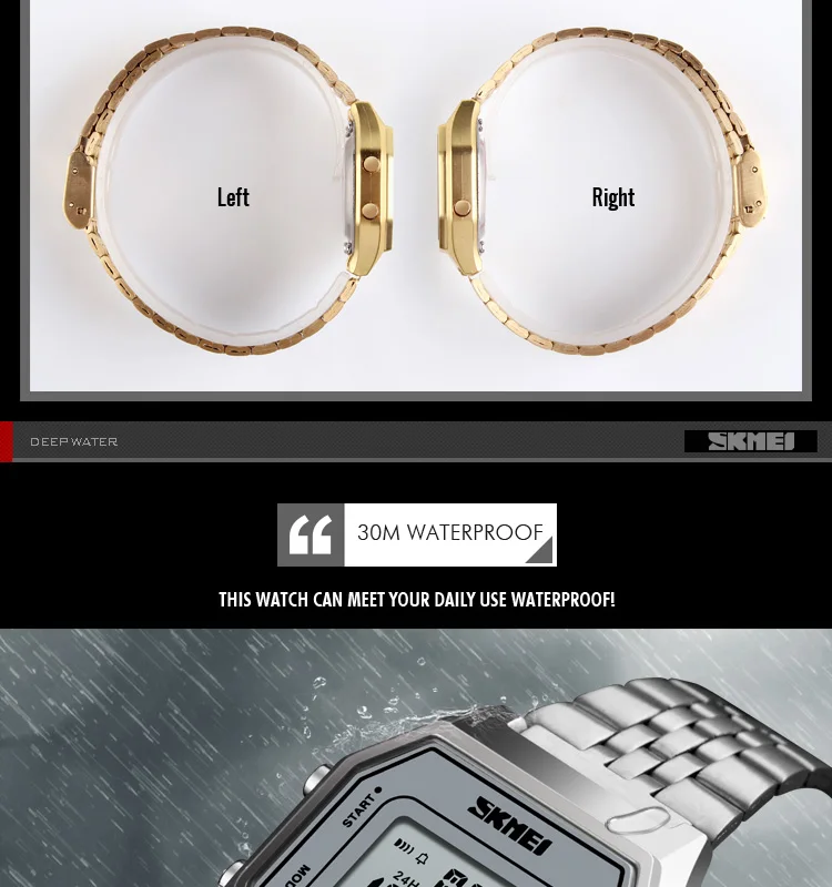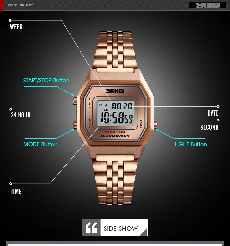 • Function: Waterproof, Time, Alarm Clock, 12/24 hour clock, EL Backlight,Week