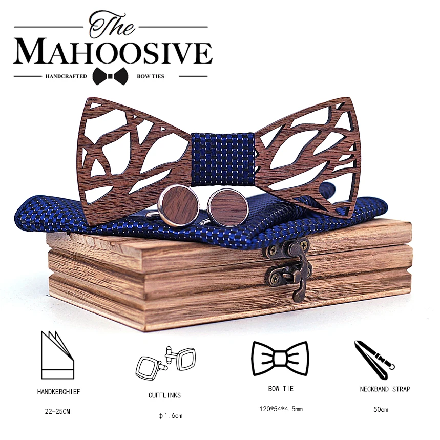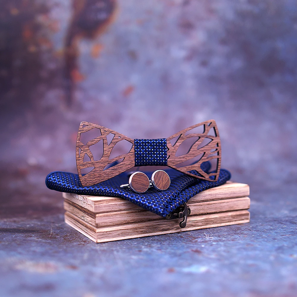 Wood Bow tie Handkerchief Cufflinks Set for Men Gift Wooden Bow Tie Bowknots for Wedding Party Ties Pocket Square Hanky Cravat