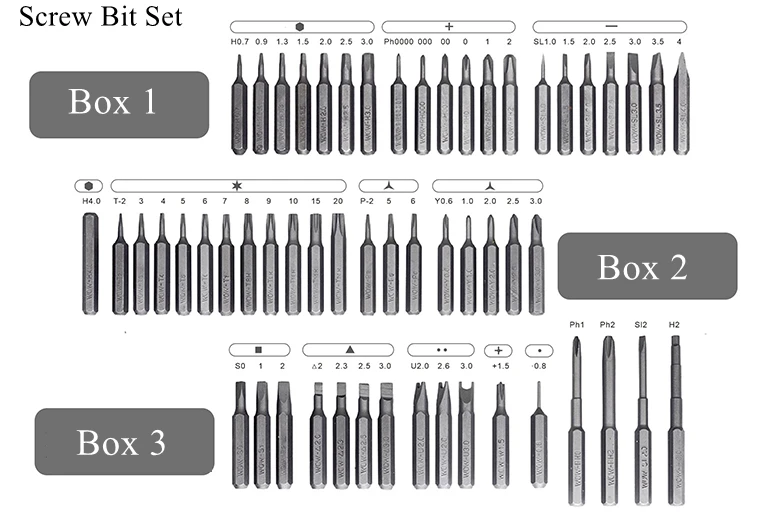 5) Carefully choose 56pcs S2 steel screwdriver bits inluding Phillips,Slotted,Hex,Trox,5-point,Y-type,Square,Triangle,Square,U-type to compatible with most electronical devices