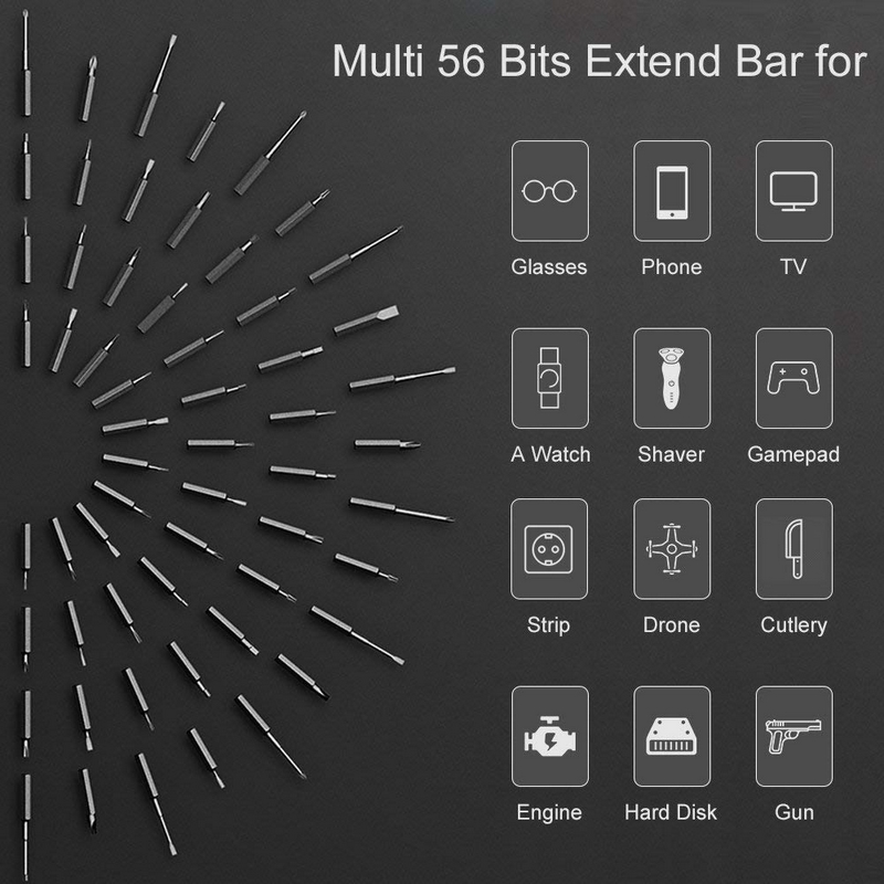 5,mode easy to use. Carefully choose 56pcs S2 steel screwdriver bits including Phillips,Slotted,Hex,Trox,5-point, Y-type,Square,Triangle,Square,U-type to compatible with most electronic devices. It also includes the wowpad, suction cup, screwdriver base, magnetizer and magnetic portable case enable you easy to carry and use.