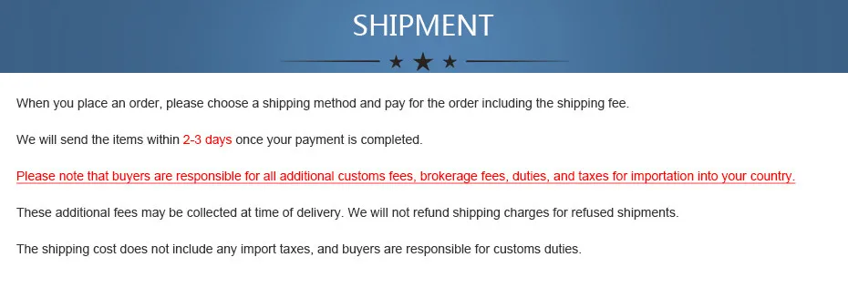 We are not responsible for any custom fees once the items have shipped. By purchasing our products, you consent that one or more packages may be shipped to you and may get custom fees when they arrive in your country.