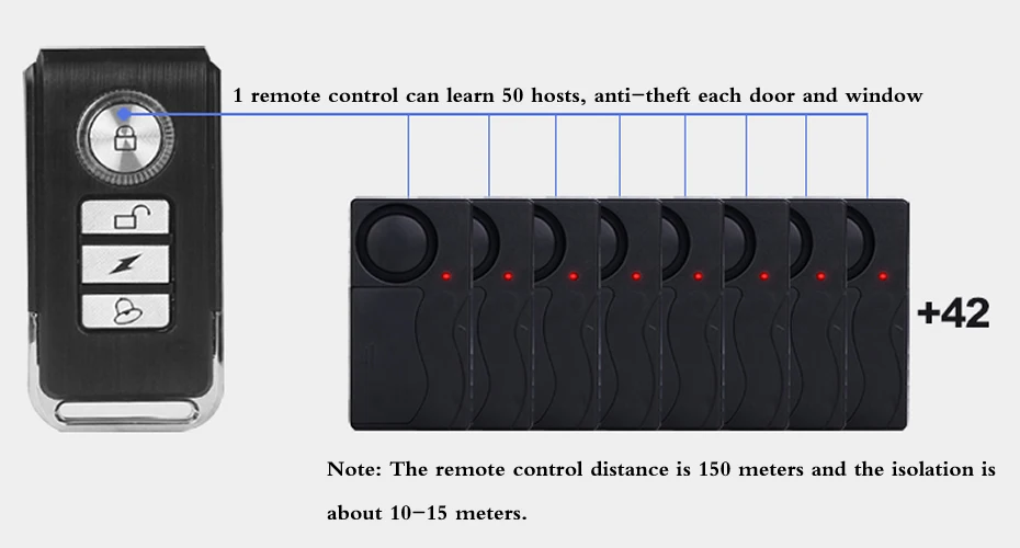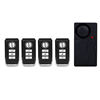 Vibration alarm with remote control, 4 mode–Arm/Disarm/Panic/Doorbell mode conveniently controlled by the remote, remote control range up to 25M