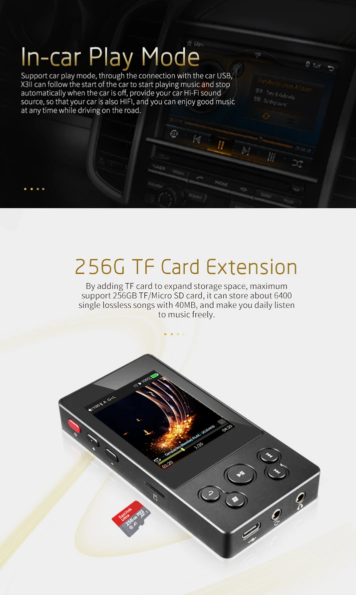 Support car play mode, through the connection with the car USB, X3II can follow the start of the car to start playing music and stop automatically when the car is off, provide your car Hi-Fi sound source, so that your car is also HIFI, and you can enjoy good music at any time while driving on the road.