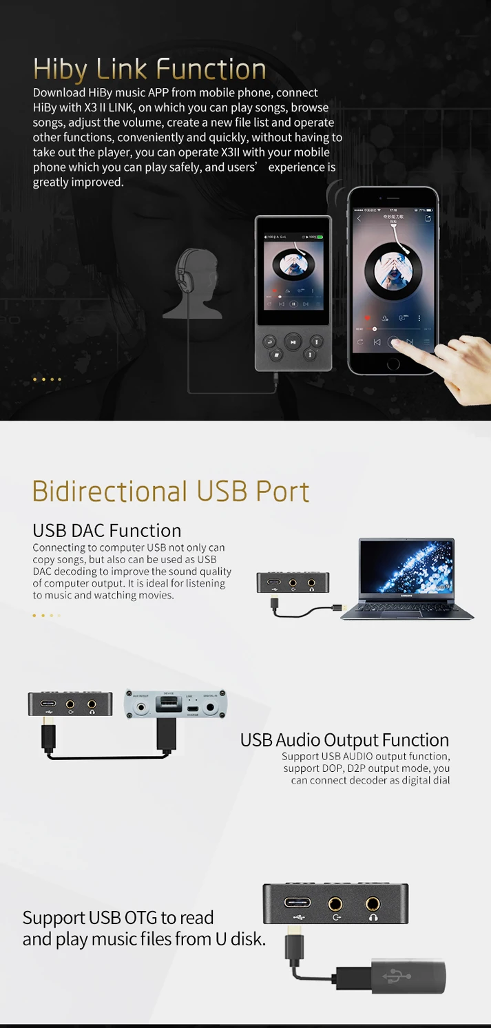 Xduoo X3II is overall upgrading version based on X3, which has a good reputation in the past generation. It adopts IPS high-definition full-angle display screen with clear picture quality, and matches 7H hardness toughened glass to effectively prevent shaving. It supports most of the popular lossless audio formats and up to DSD128 high-definition sampling rate songs at 384 kHz/32 bit. This product has added Bi-directional 4.0 Bluetooth transmissions, can connect with Bluetooth headset, also connect with mobile phone Bluetooth for decoding to improve the sound quality of mobile phone. At the same time, the HIBY LINK function is also added, which can also be used to control the device through the mobile phone. The USB port also has the Bi-directional function, that is, it can output the USB audio & video, and can also connect the computer USB port as the USB DAC function, which greatly increases the playability. The product has a lot of fun and is worth owing.