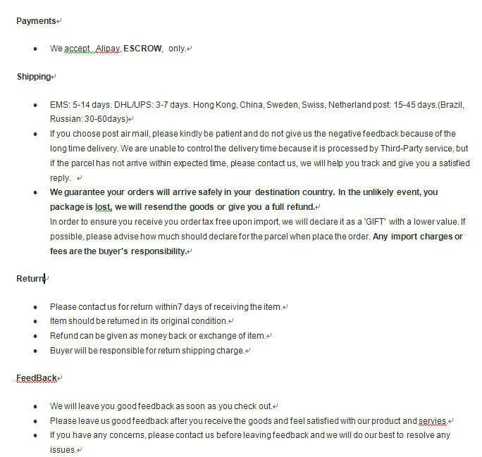 • If you did not receive the product within the guaranteed time( 45 days not including 2-5 day processing) you can request a refund or a reshipment.
