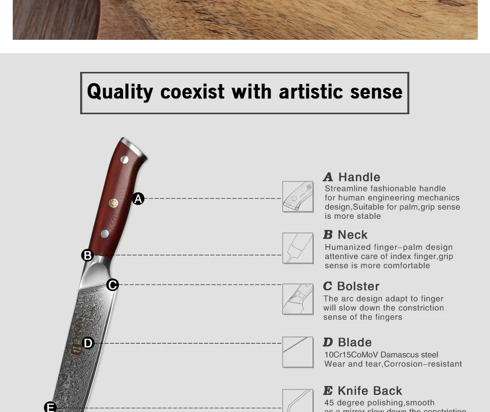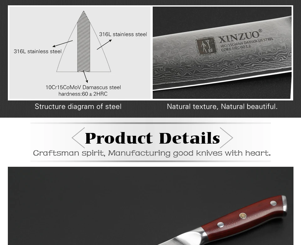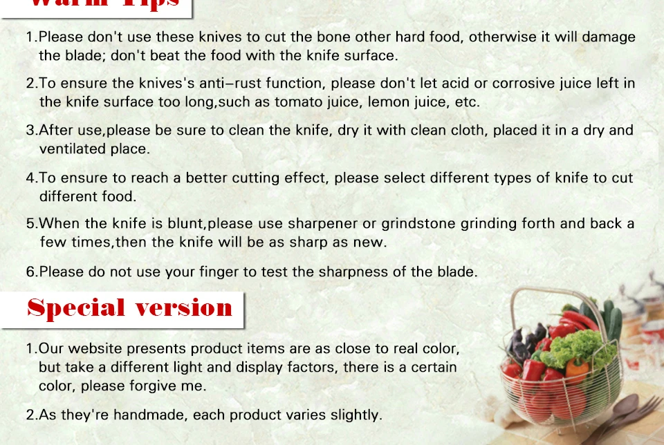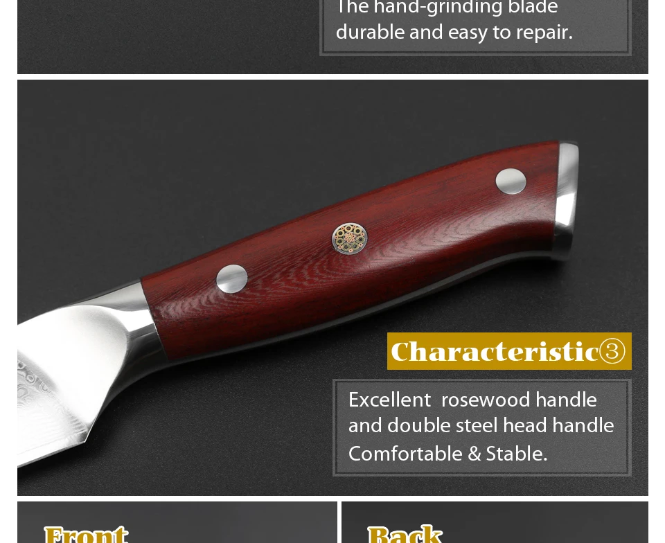 Handle : Excellent rosewood handle, surface polishing . Use for a long time not to distort, not faded, not shrinking, tasteless environmental protection.