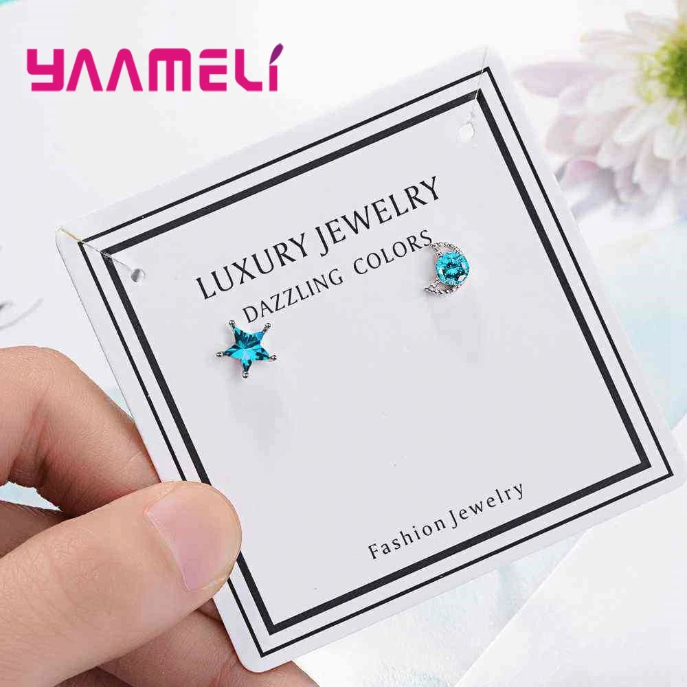 YAAMELI New Romantic Women Fashion Blue Zirconia Star Moon Stud Earrings 925 Sterling Silver Girls Trendy Party Jewelry Gifts