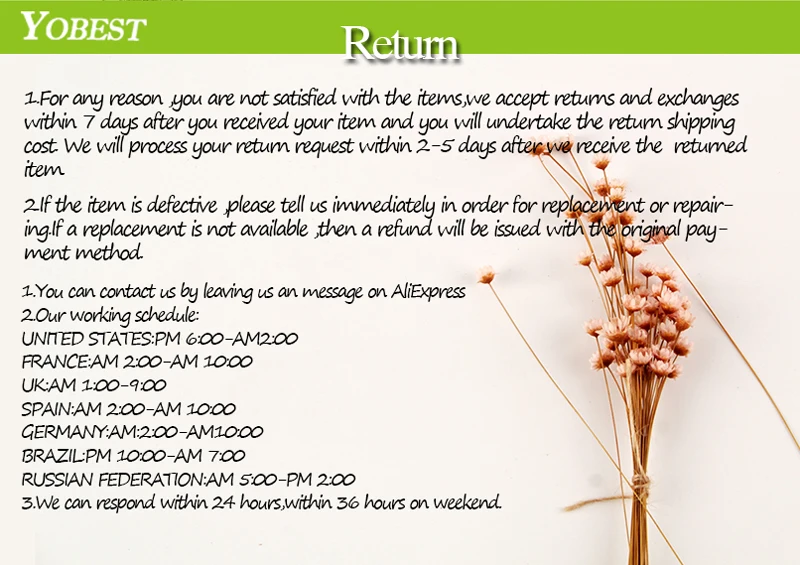 • If you did not receive the product within the guaranteed time( 45 days not including 2-5 day processing) you can request a refund or a reshipment.