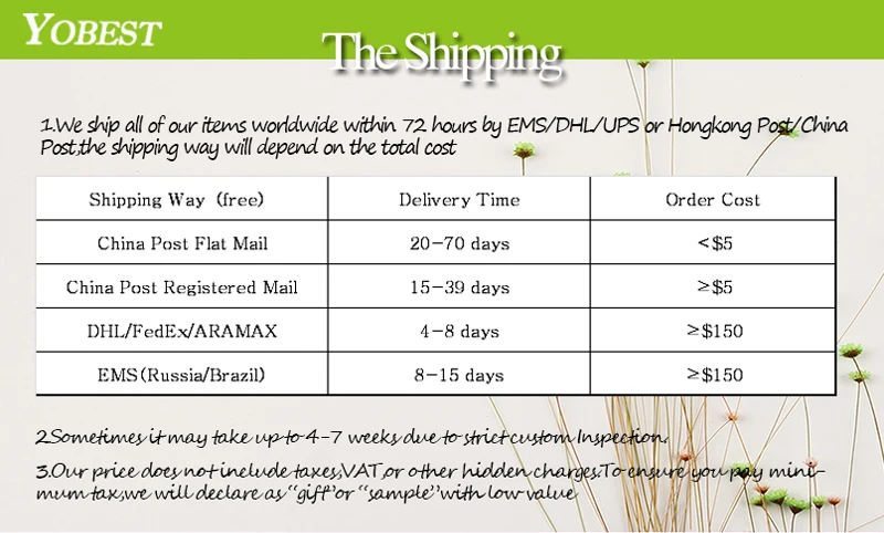 Packages from our warehouse in China will be shipped by ePacket or EMS depending on the weight and size of the product. Packages shipped from our US warehouse are shipped through USPS.