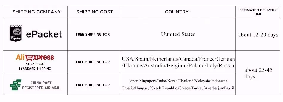Packages from our warehouse in China will be shipped by ePacket or EMS depending on the weight and size of the product. Packages shipped from our US warehouse are shipped through USPS.