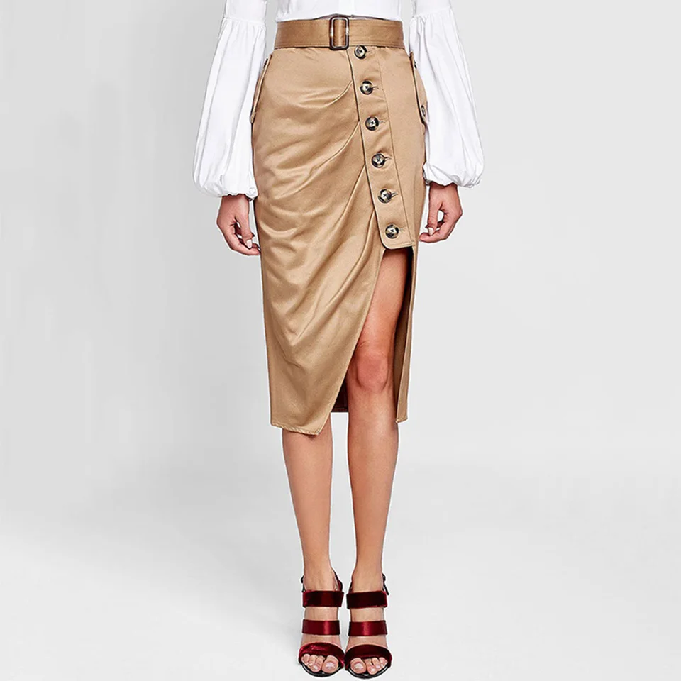 Young17 Autumn Skirt 2017 High-Waist Khaki Fashion England Style Preppy Asymmetrical Winter Button Skirt Women A-Line Skirt