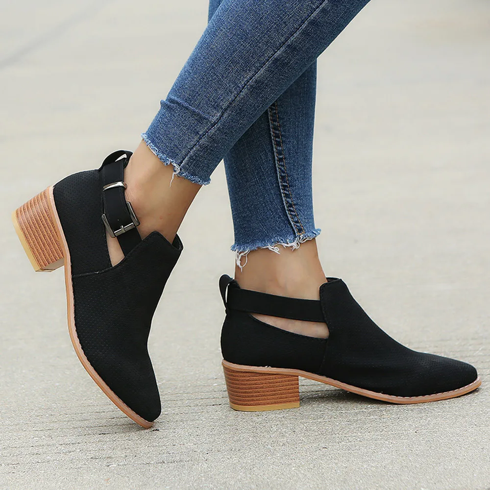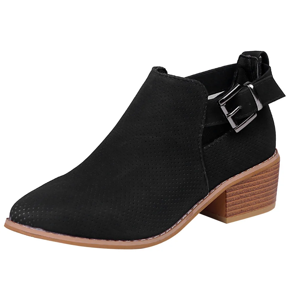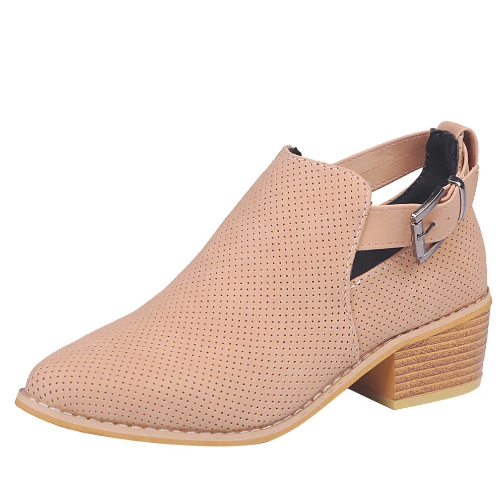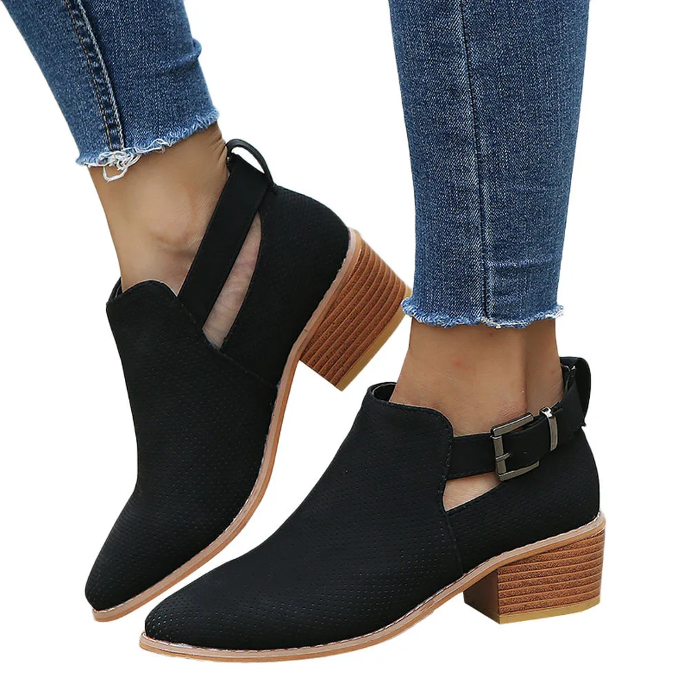 Women Pointed Toe Shoes Hollow Booties Buckle Strap Square Heel Single Shoes