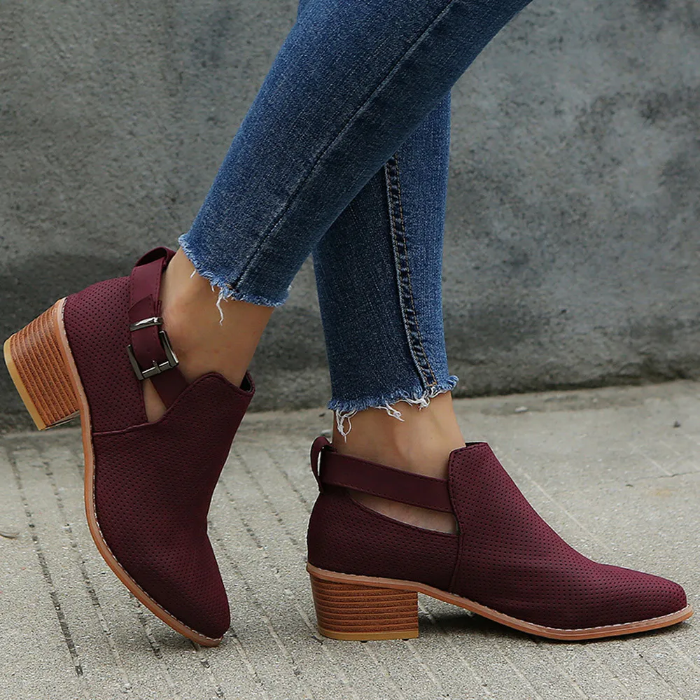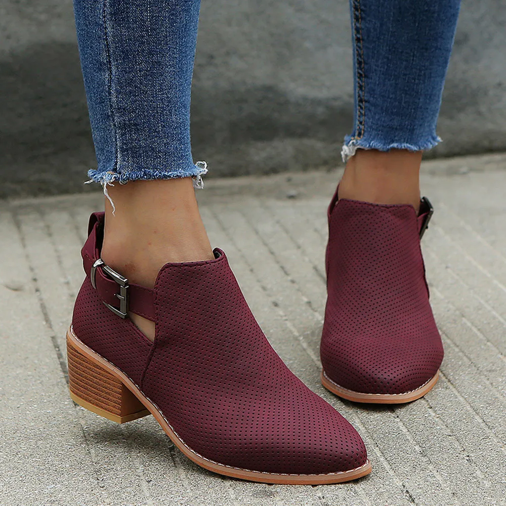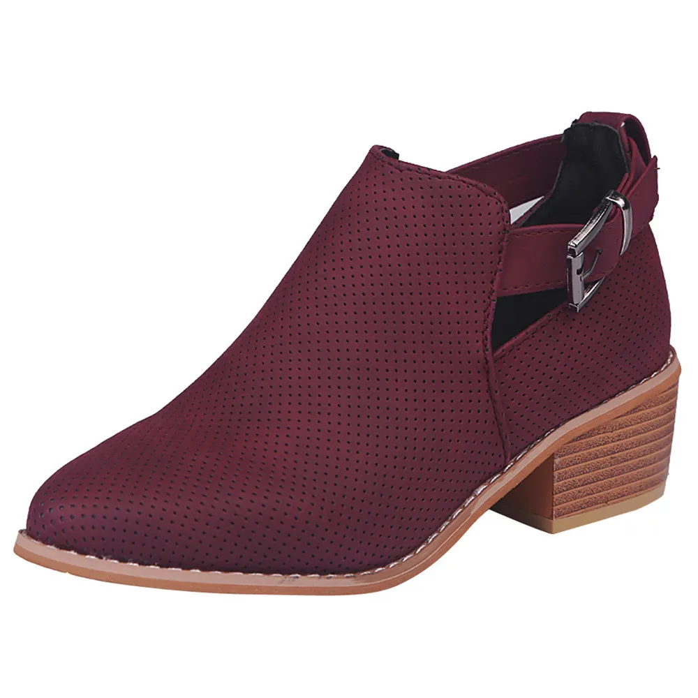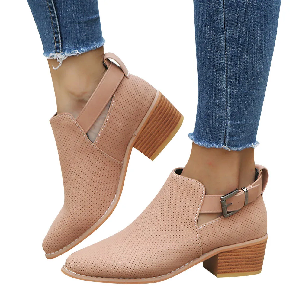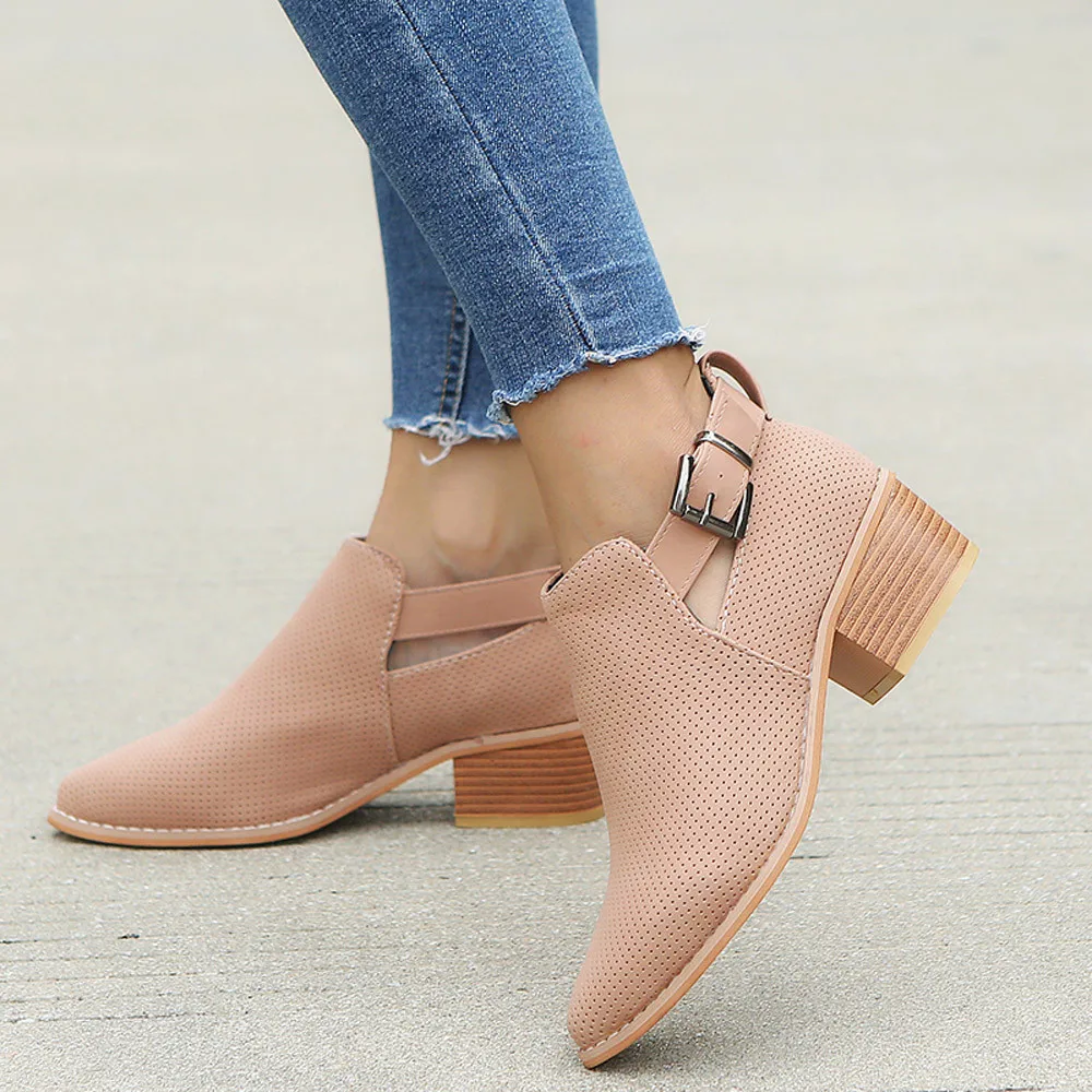Women Pointed Toe Shoes Hollow Booties Buckle Strap Square Heel Single Shoes