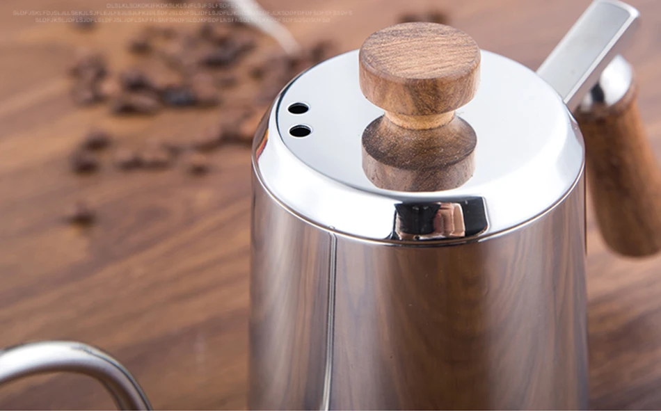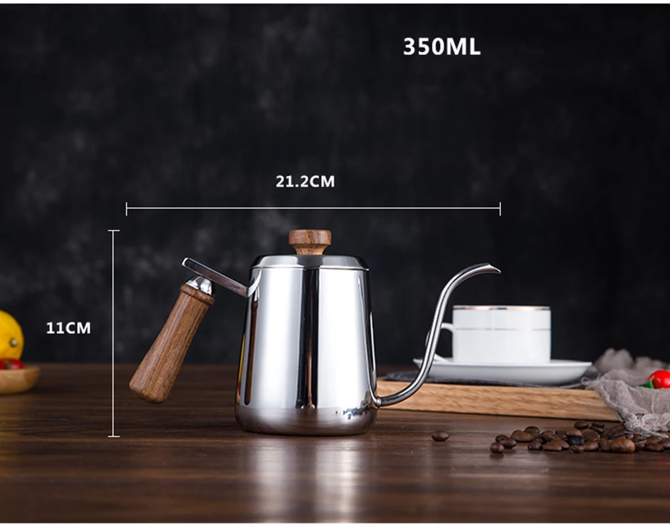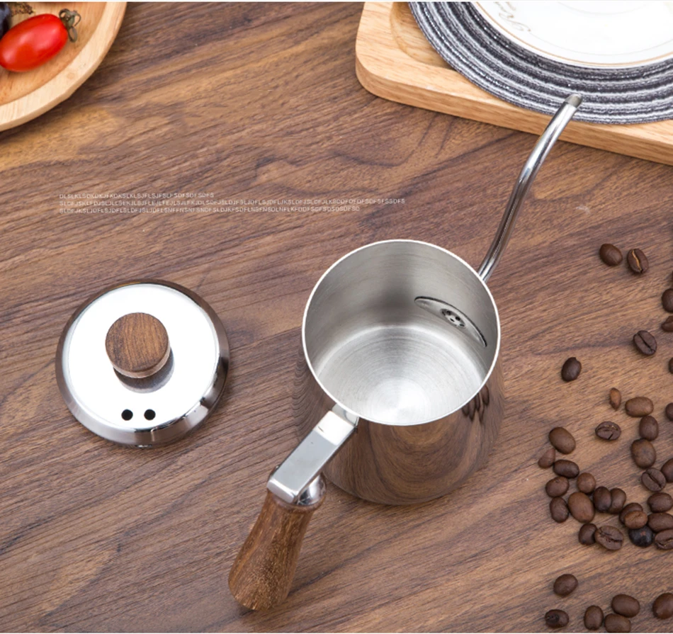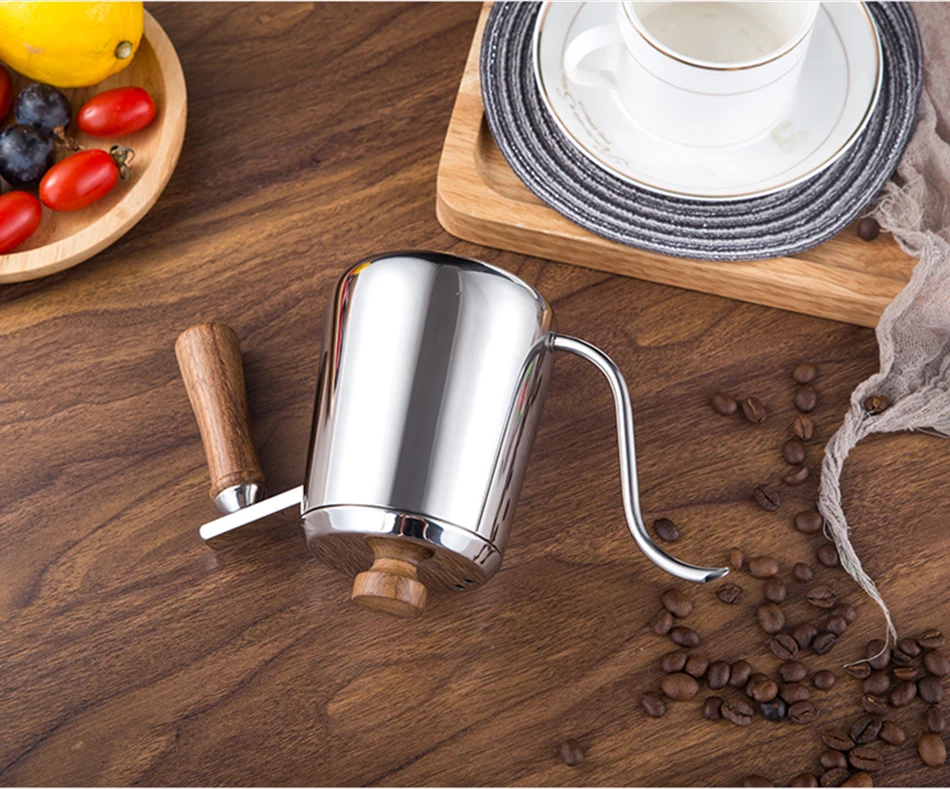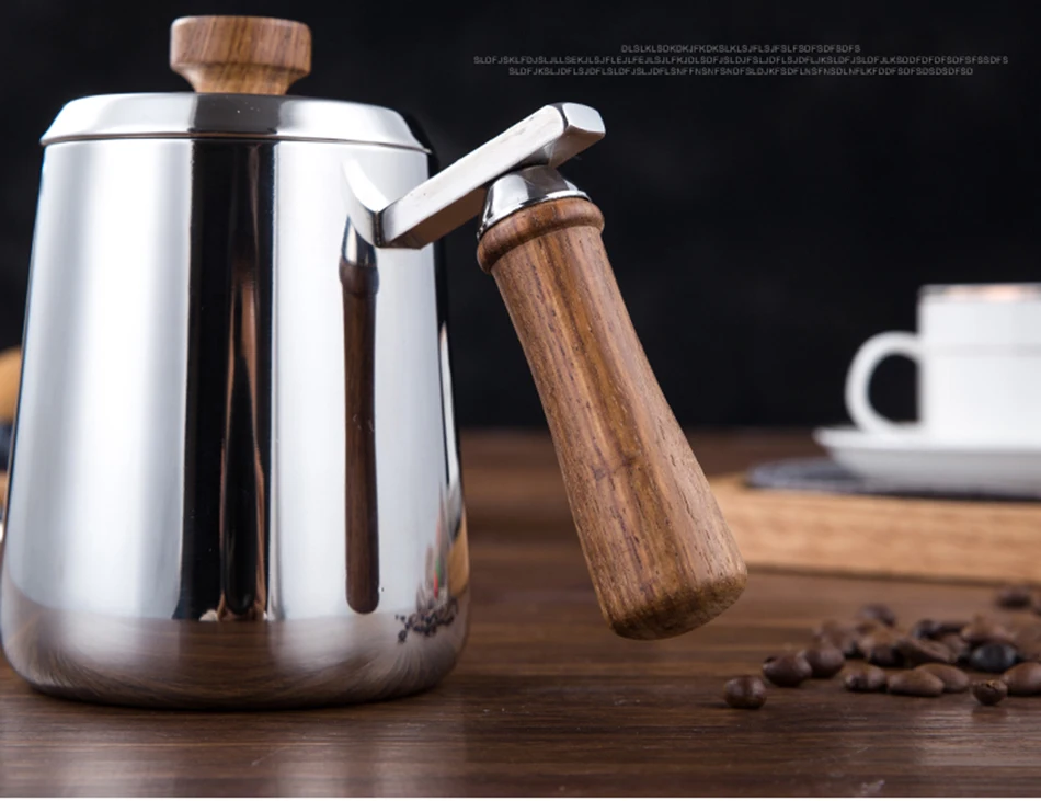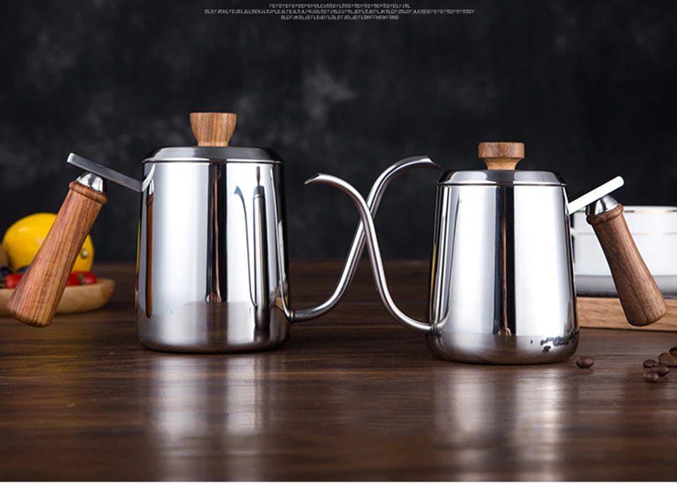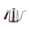 Long mouth water control coffee hand pot, anti-scalding wooden handle, stainless steel body