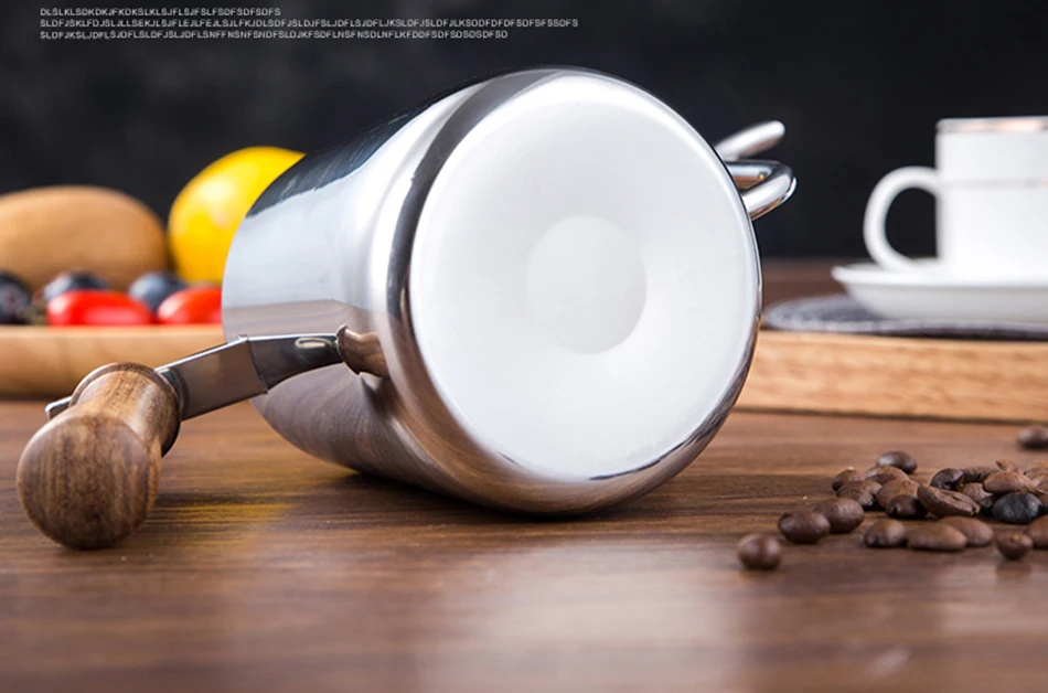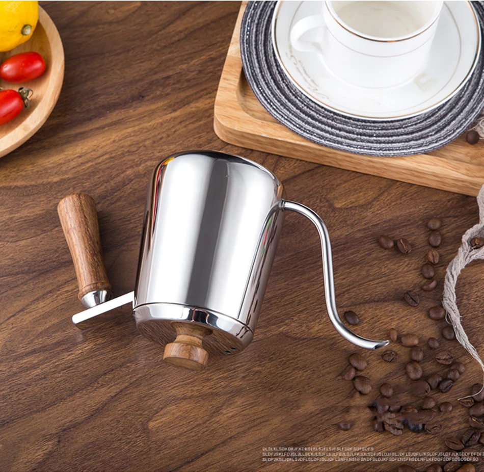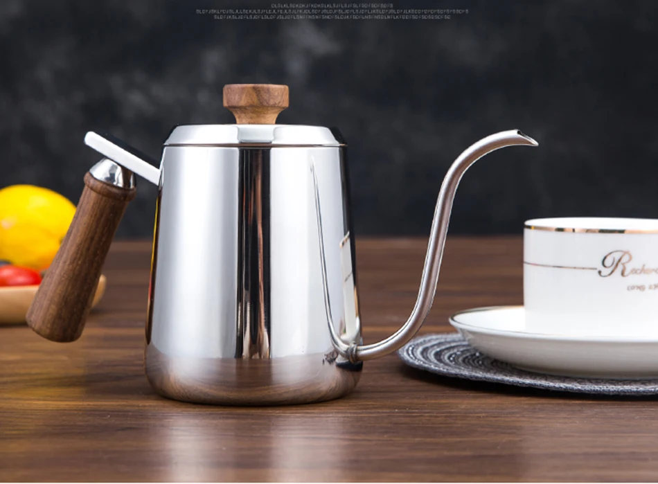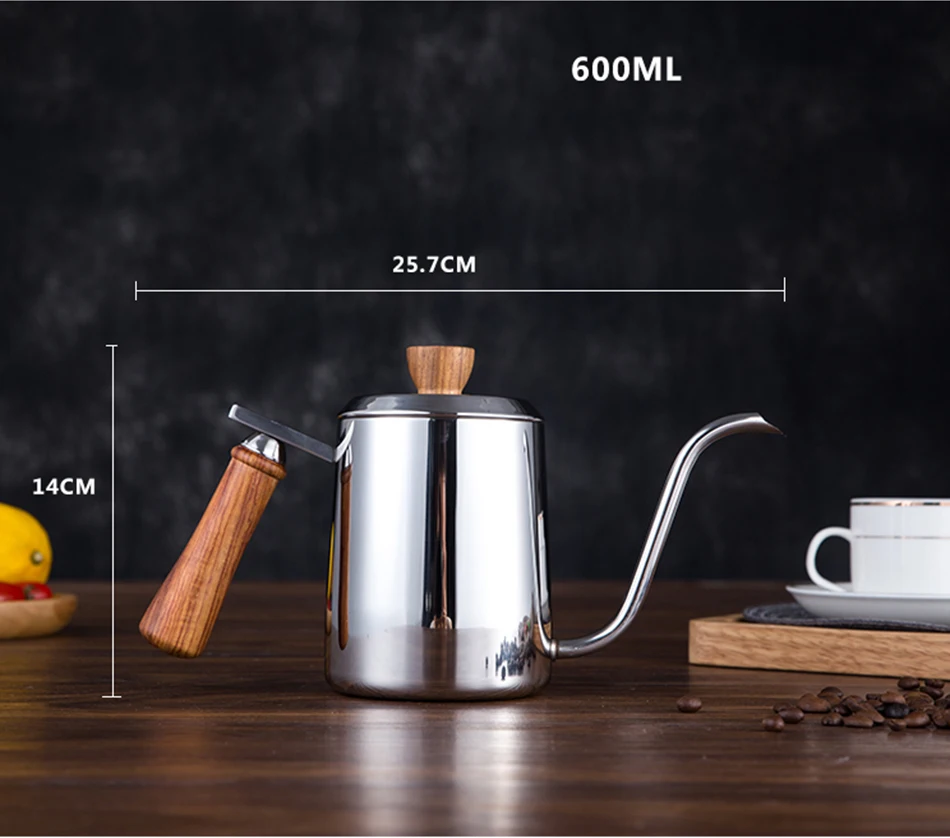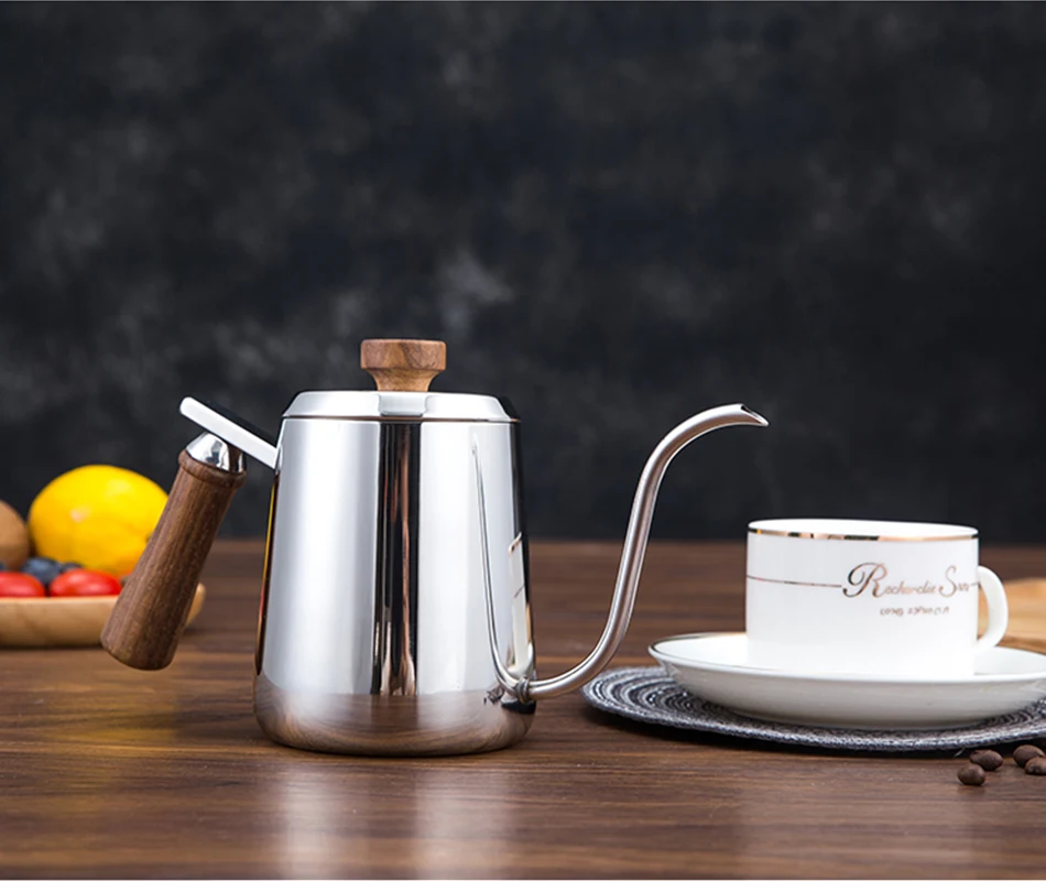 Long mouth water control coffee hand pot, anti-scalding wooden handle, stainless steel body
