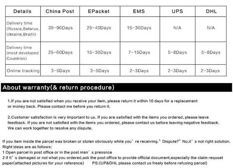 • If you did not receive the product within the guaranteed time( 45 days not including 2-5 day processing) you can request a refund or a reshipment.