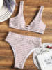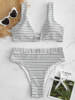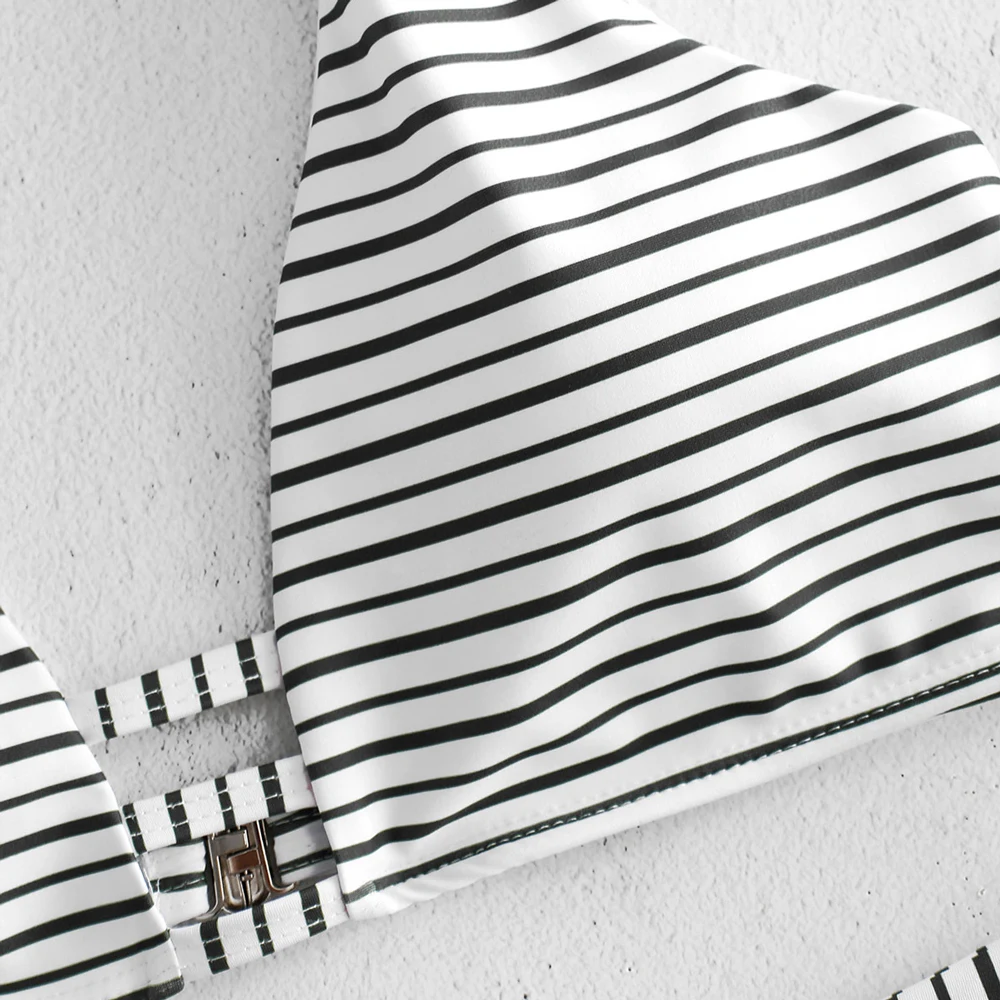 Simple yet fashion style, this bikini set feature a striped pattern, low cut front design. High waisted bikini bottoms in a high cut leg.
