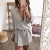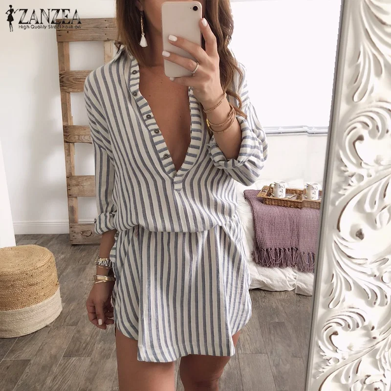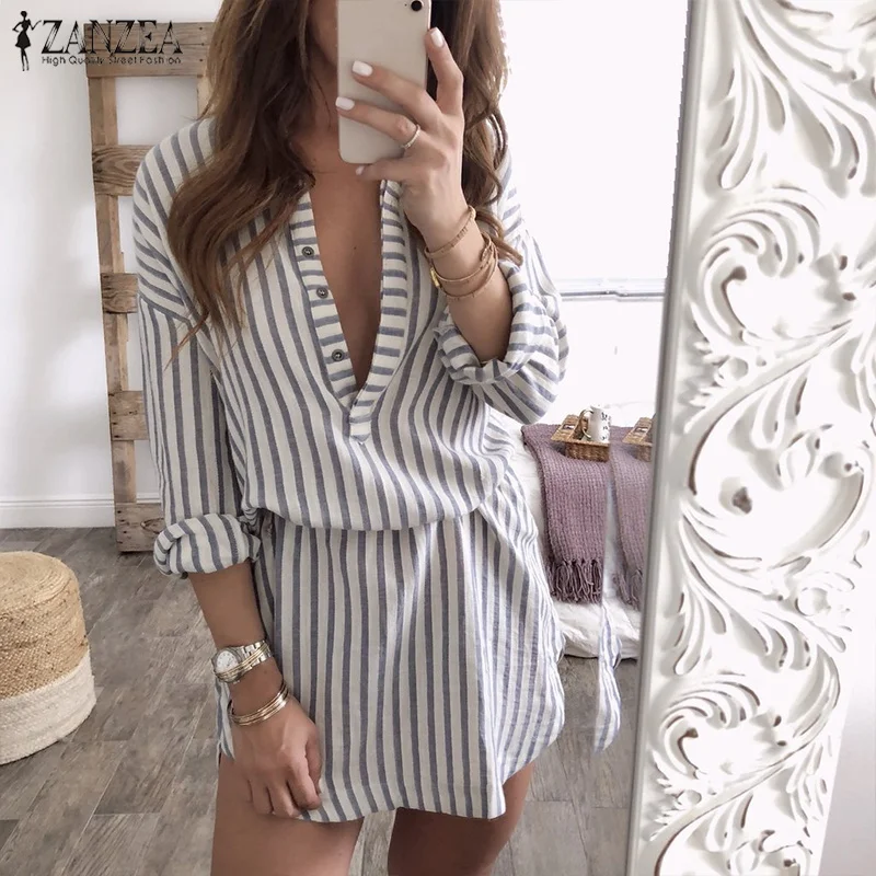 ZANZEA 2018 Autumn Women Sexy Deep V Neck Striped Shirt Dress Lapel Neck Buttons Casual Robe Mini Vestido Femme Long Tops Blusas